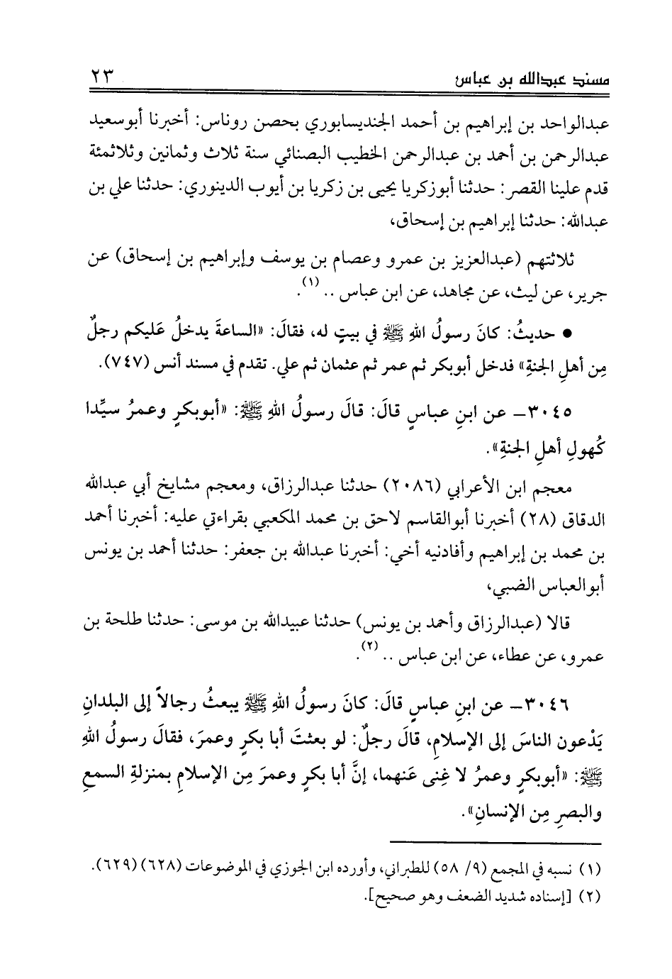 3045 - عن ابنِ عباسٍ قالَ: قالَ رسولُ اللهِ صلى الله عليه وسلم: «أبوبكرٍ وعمرُ سيِّدا كُهولِ أهلِ الجنةِ».