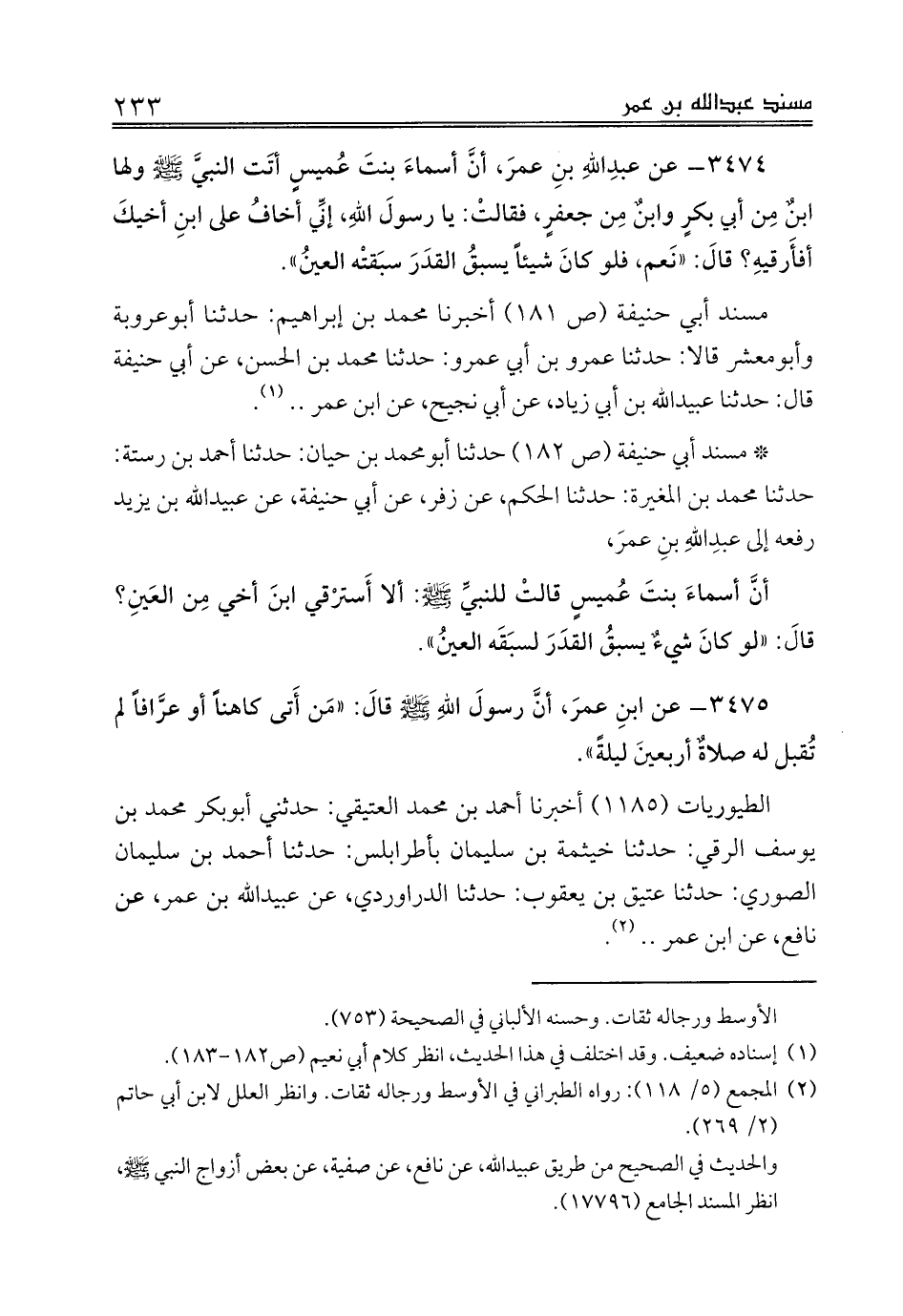 مسند أبي حنيفة (ص 181) أخبرنا محمد بن إبراهيم: حدثنا أبوعروبة وأبومعشر قالا: حدثنا عمرو بن أبي عمرو: حدثنا محمد بن الحسن، عن أبي حنيفة قال: حدثنا عبيدالله بن أبي زياد، عن أبي نجيح، عن ابن عمر .. (¬1).