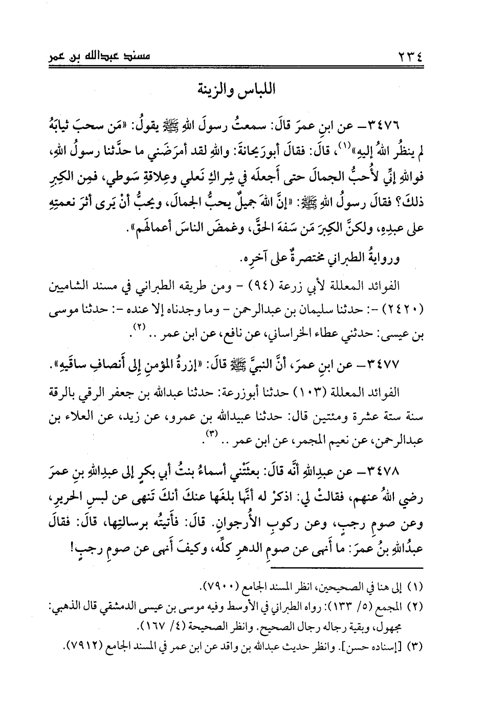 3476 - عن ابنِ عمرَ قالَ: سمعتُ رسولَ اللهِ صلى الله عليه وسلم يقولُ: «مَن سحبَ ثيابَهُ لم ينظُر اللهُ إليهِ» (¬1)، قالَ: فقالَ أبورَيحانةَ: واللهِ لقد أمرَضَني ما حدَّثنا رسولُ اللهِ، فواللهِ إنِّي لأُحبُّ الجمالَ حتى أَجعلَه في شِراكِ نَعلي وعِلاقةِ سَوطي، فمِن الكِبرِ ذلكَ؟ فقالَ رسولُ اللهِ صلى الله عليه وسلم: «إنَّ اللهَ جميلٌ يحبُّ الجمالَ، ويحبُّ أنْ يَرى أثرَ نعمتِهِ على عبدِهِ، ولكنَّ الكِبرَ مَن سَفهَ الحقَّ، وغمضَ الناسَ أعمالَهم».