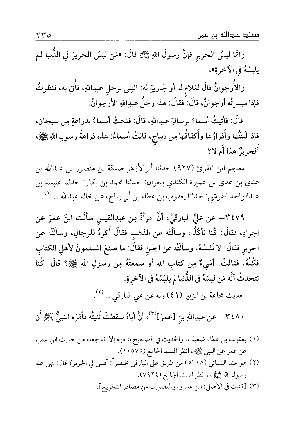 3479 - عن عليٍّ البارقيِّ، أنَّ امرأةً مِن عبدِالقيسِ سألَت ابنَ عمرَ عن الجرادِ، فقالَ: كُنا نأكُلُه، وسألَتْه عن الذهبِ فقالَ أَكرهُ للرجالِ، وسألَتْه عن الحريرِ فقالَ: لا نَلبسُهُ، وسألَتْه عن الجبنِ فقالَ: ما صنعَ المسلمونَ لأهلِ الكتابِ فكُلْهُ، فقالتْ: أشيءٌ مِن كتابِ اللهِ أو سمعتَهُ مِن رسولِ اللهِ صلى الله عليه وسلم؟ قالَ: كُنا نتحدثُ أنَّه مَن لبسَهُ في الدُّنيا لم يلبَسْهُ في الآخرِةِ.