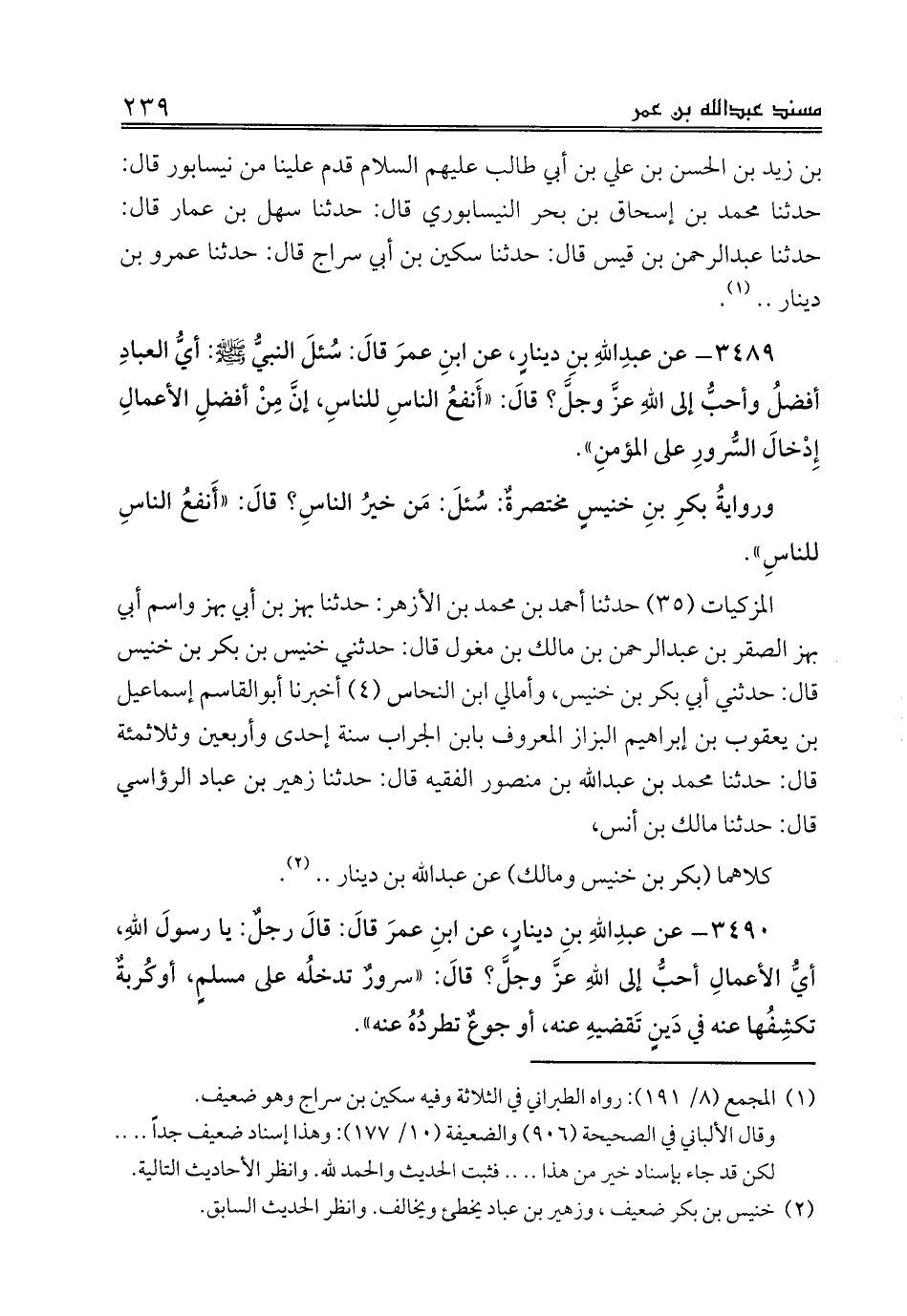 3489 - عن عبدِاللهِ بنِ دينارٍ، عن ابنِ عمرَ قالَ: سُئلَ النبيُّ صلى الله عليه وسلم: أيُّ العبادِ أفضلُ وأحبُّ إلى اللهِ عزَّ وجلَّ؟ قالَ: «أَنفعُ الناسِ للناسِ، إنَّ مِنْ أفضلِ الأعمالِ إِدْخالُ السُّرورِ على المؤمنِ».