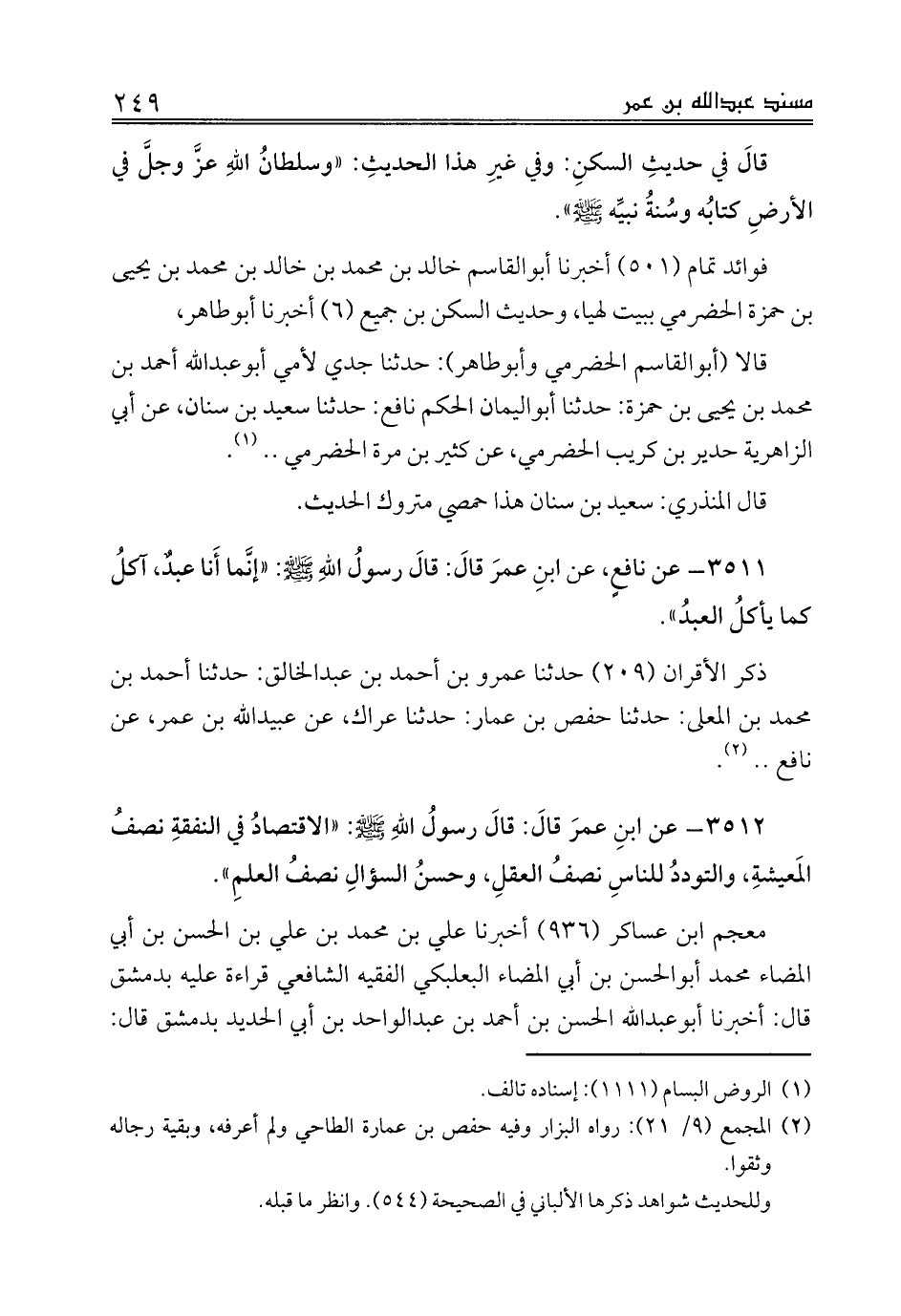 قالَ في حديثِ السكنِ: وفي غيرِ هذا الحديثِ: «وسلطانُ اللهِ عزَّ وجلَّ في الأرضِ كتابُه وسُنةُ نبيِّه صلى الله عليه وسلم».