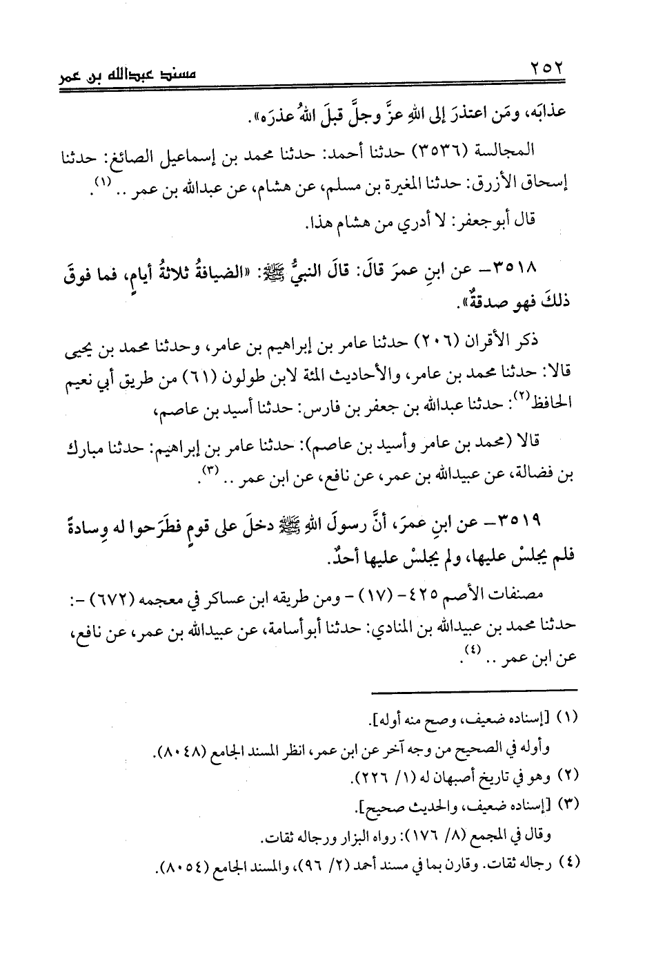3518 - عن ابنِ عمرَ قالَ: قالَ النبيُّ صلى الله عليه وسلم: «الضيافةُ ثلاثةُ أيامٍ، فما فوقَ ذلكَ فهو صدقةٌ».