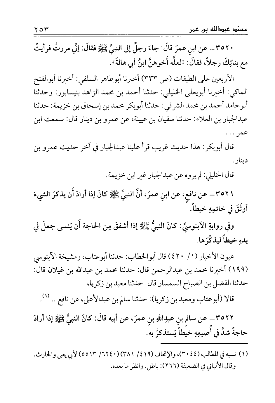 3522 - عن سالمِ بنِ عبدِاللهِ بنِ عمرَ، عن أبيه قالَ: كانَ النبيُّ صلى الله عليه وسلم إذا أرادَ حاجةً شدَّ في أُصبعِهِ خيطاً يَستذكرُ به.