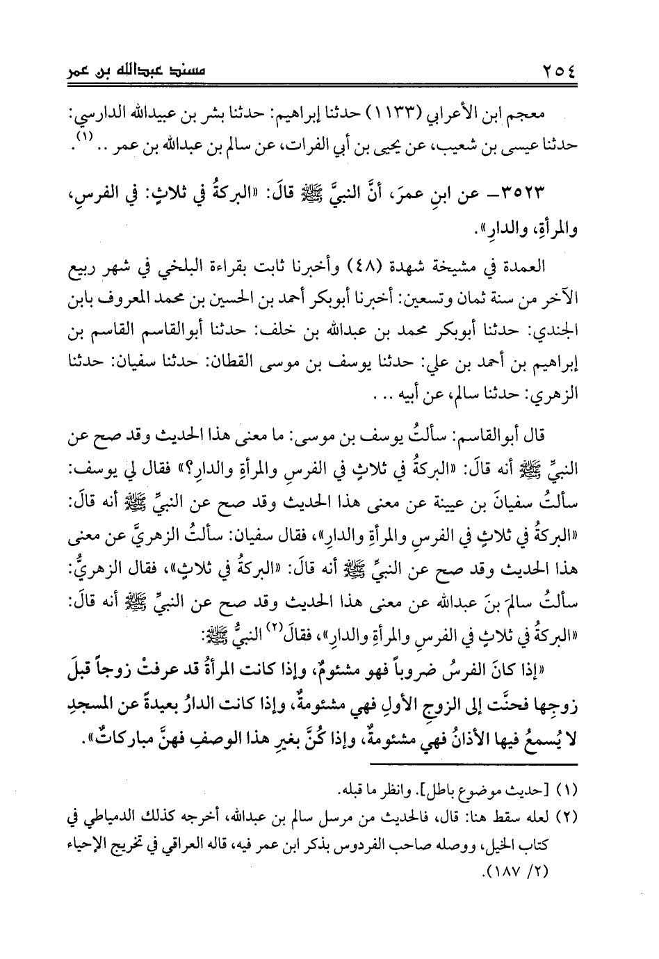 قال أبوالقاسم: سألتُ يوسف بن موسى: ما معنى هذا الحديث وقد صح عن النبيِّ صلى الله عليه وسلم أنه قالَ: «البركةُ في ثلاثٍ في الفرسِ والمرأةِ والدارِ؟» فقال لي يوسف: سألتُ سفيانَ بن عيينة عن معنى هذا الحديث وقد صح عن النبيِّ صلى الله عليه وسلم أنه قالَ: «البركةُ في ثلاثٍ في الفرسِ والمرأةِ والدارِ»، فقال سفيان: سألتُ الزهريَّ عن معنى هذا الحديث وقد صح عن النبيِّ صلى الله عليه وسلم أنه قالَ: «البركةُ في ثلاثٍ»، فقال الزهريُّ: سألتُ سالمَ بنَ عبدالله عن معنى هذا الحديث وقد صح عن النبيِّ صلى الله عليه وسلم أنه قالَ: «البركةُ في ثلاثٍ في الفرسِ والمرأةِ والدارِ»، فقالَ (¬2) النبيُّ صلى الله عليه وسلم: