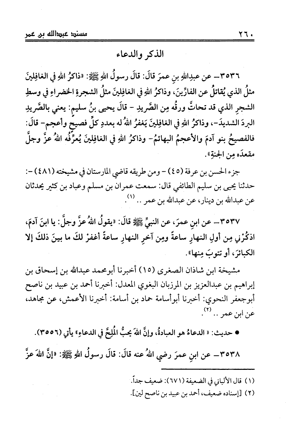 3536 - عن عبدِاللهِ بنِ عمرَ قالَ: قالَ رسولُ اللهِ صلى الله عليه وسلم: «ذاكرُ اللهِ في الغافِلينَ مثلُ الذي يُقاتلُ عن الفارِّينَ، وذاكرُ اللهِ في الغافِلينَ مثلُ الشجرةِ الخضراءِ في وسطِ الشجرِ الذي قد تحاتَّ ورقُه مِن الصَّريدِ - قالَ يحيى بنُ سليمٍ: يعني بالصَّريدِ البردَ الشديدَ-، وذاكرُ اللهِ في الغافِلينَ يَغفرُ اللهُ له بعددِ كلِّ فصيحٍ وأعجم- قالَ: فالفصيحُ بنو آدمَ والأعجمُ البهائمُ- وذاكرُ اللهِ في الغافِلينَ يُعرِّفُه اللهُ عزَّ وجلَّ مقعدَه مِن الجنةِ».