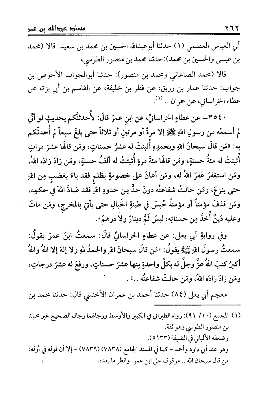 3540 - عن عطاءٍ الخراسانيِّ، عن ابنِ عمرَ قالَ: لأُحدثنَّكم بحديثٍ لو أنِّي لم أسمعْه من رسولِ اللهِ صلى الله عليه وسلم إلا مرةً أو مرتينِ أو ثلاثاً حتى بلغَ سبعاً لم أُحدثْكم به: «مَن قالَ سبحانَ اللهِ وبحمدِهِ أُثبتتْ له عشرُ حسناتٍ، ومَن قالَها عشرَ مراتٍ أُثبتتْ له مئةُ حسنةٍ، ومَن قالَها مئةَ مرةٍ أُثبتتْ له ألفُ حسنةٍ، ومَن زادَ زادَه اللهُ، ومَن استغفرَ غفرَ اللهُ له، ومَن أعانَ على خصومةٍ بظلمٍ فقد باءَ بغضبٍ مِن اللهِ حتى ينزعَ، ومَن حالتْ شفاعتُه دونَ حدٍّ مِن حدودِ اللهِ فقد ضادَّ اللهَ في حكمِه،، ومَن قذفَ مؤمناً أو مؤمنةً حُبسَ في طينةِ الخَبالِ حتى يأتيَ بالمخرجِ، ومَن ماتَ وعليه دَينٌ أُخذَ مِن حسناتِه، ليسَ ثَمَّ دينارٌ ولا درهمٌ».