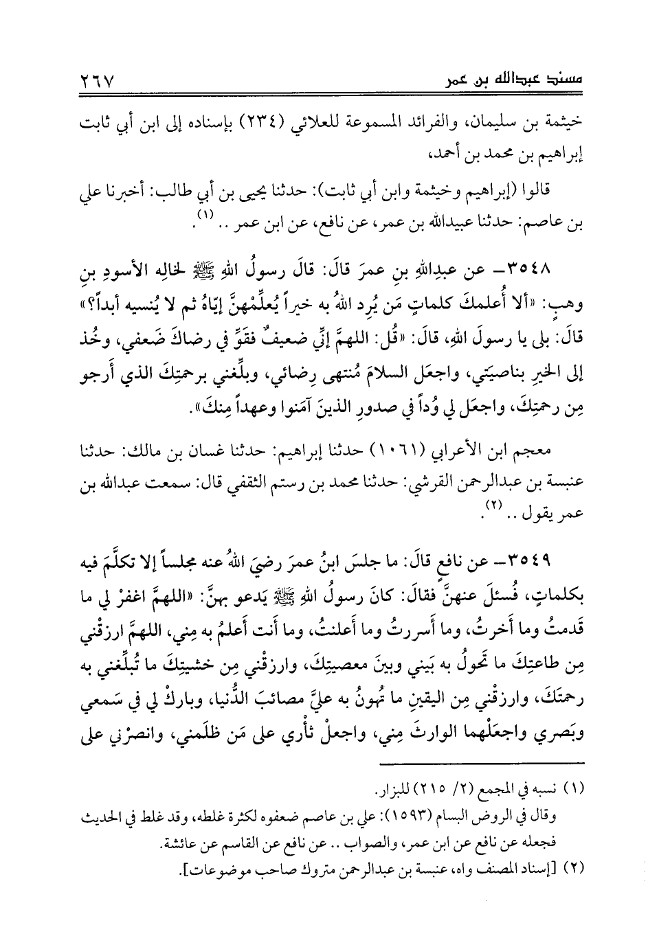3548 - عن عبدِاللهِ بنِ عمرَ قالَ: قالَ رسولُ اللهِ صلى الله عليه وسلم لخالِه الأسودِ بنِ وهبٍ: «ألا أُعلمكَ كلماتٍ مَن يُرِد اللهُ به خيراً يُعلِّمْهنَّ إيّاهُ ثم لا يُنسيه أبداً؟» قالَ: بلى يا رسولَ اللهِ، قالَ: «قُل: اللهمَّ إنِّي ضعيفٌ فقَوِّ في رضاكَ ضَعفي، وخُذ إلى الخيرِ بناصيَتي، واجعَل السلامَ مُنتهى رِضائي، وبلِّغني برحمتِكَ الذي أَرجو مِن رحمتِكَ، واجعَل لي وُداً في صدورِ الذينَ آمَنوا وعهداً مِنكَ».