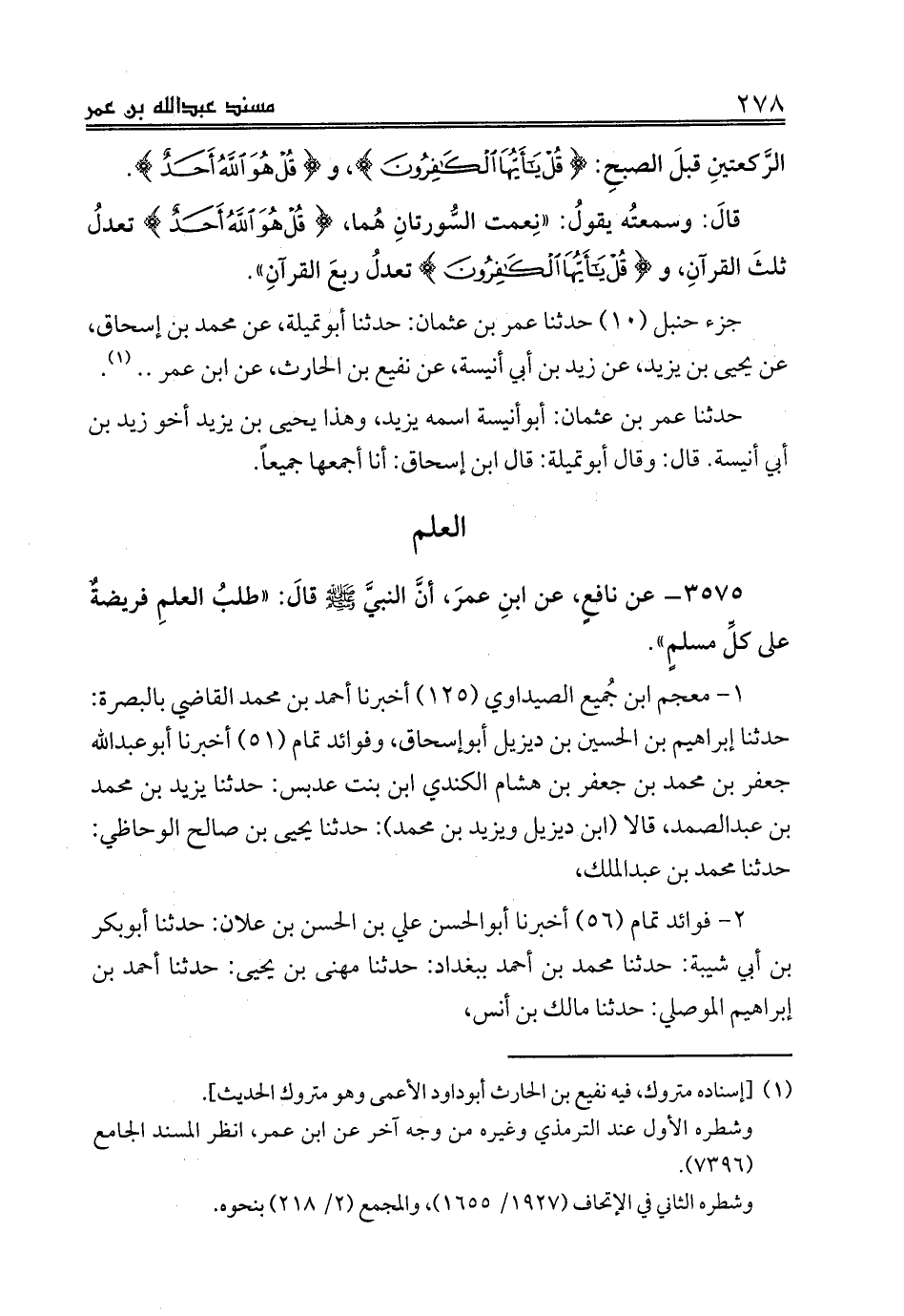 3575 - عن نافعٍ، عن ابنِ عمرَ، أنَّ النبيَّ صلى الله عليه وسلم قالَ: «طلبُ العلمِ فريضةٌ على كلِّ مسلمٍ».