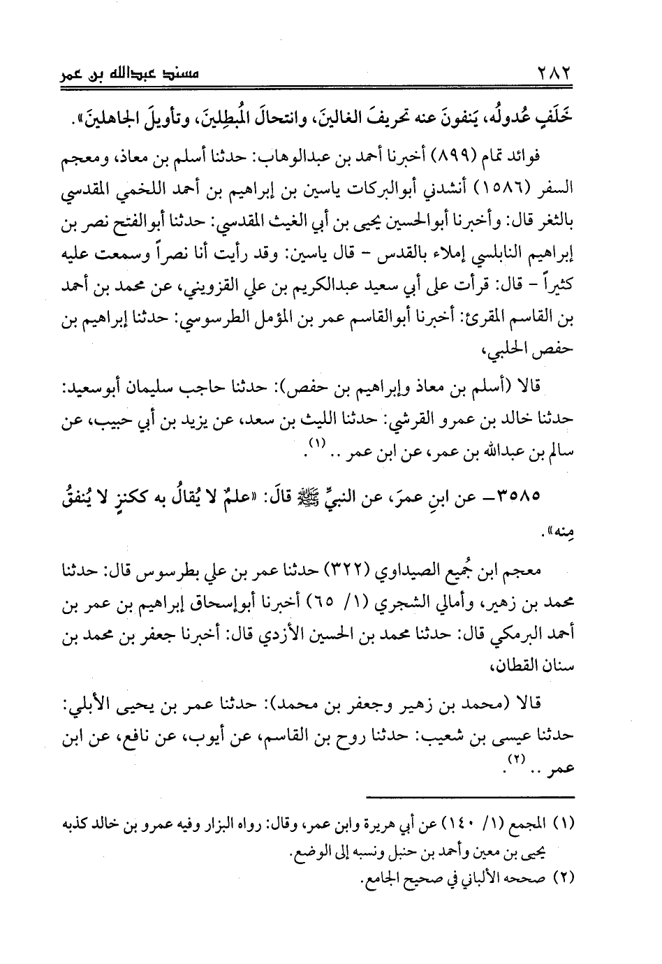 قالا (محمد بن زهير وجعفر بن محمد): حدثنا عمر بن يحيى الأبلي: حدثنا عيسى بن شعيب: حدثنا روح بن القاسم، عن أيوب، عن نافع، عن ابن عمر .. (¬2).