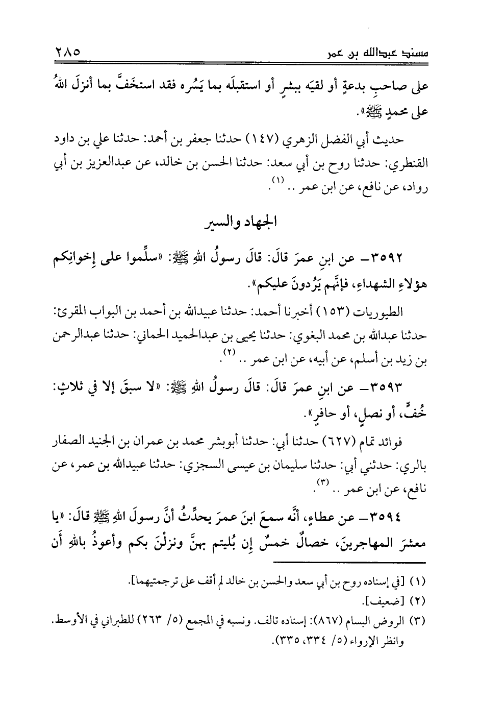 3592 - عن ابنِ عمرَ قالَ: قالَ رسولُ اللهِ صلى الله عليه وسلم: «سلِّموا على إِخوانِكم هؤلاءِ الشهداءِ، فإنَّهم يَرُدونَ عليكم».