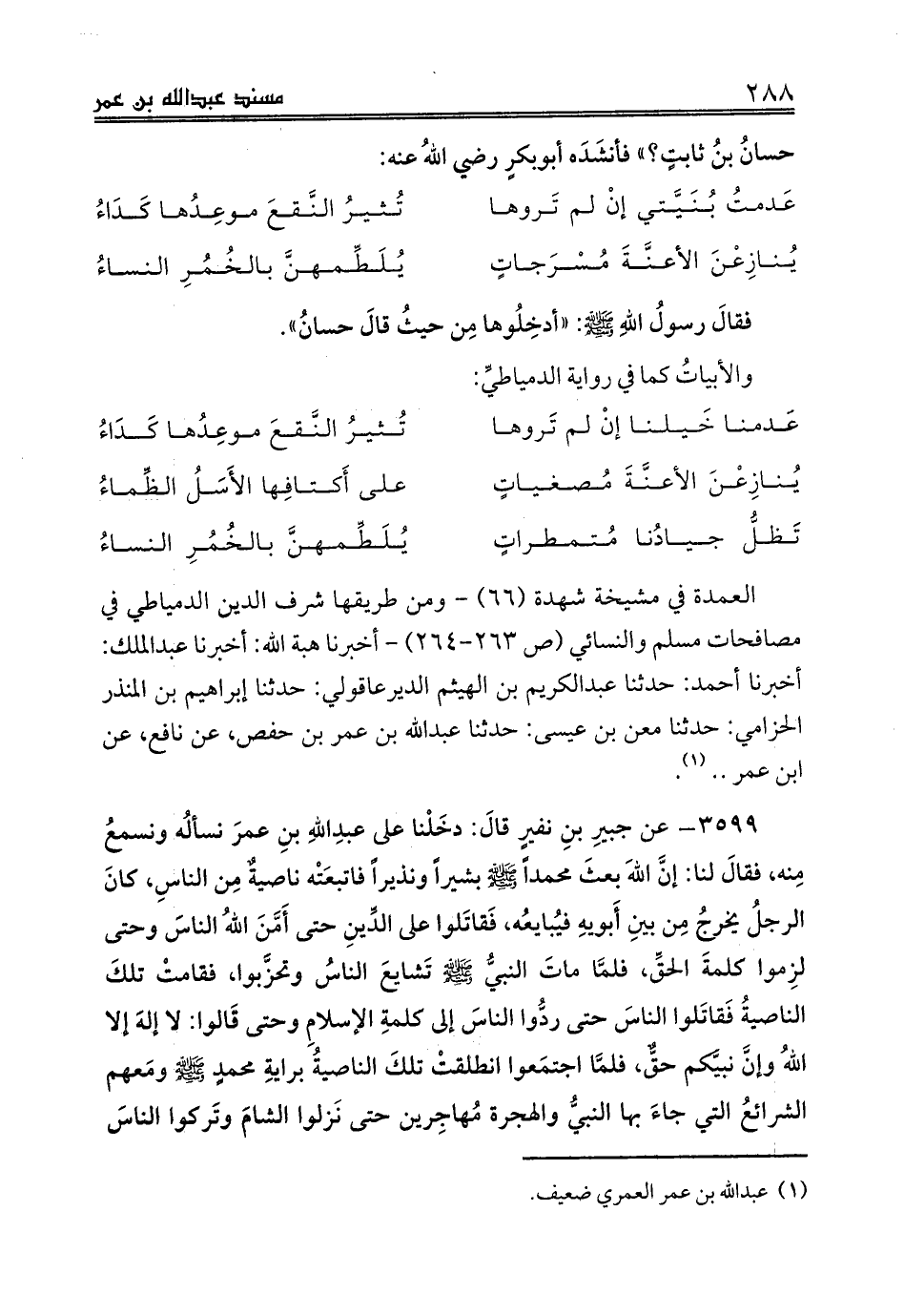 3599 - عن جبيرِ بنِ نفيرٍ قالَ: دخَلْنا على عبدِاللهِ بنِ عمرَ نسألُه ونسمعُ مِنه، فقالَ لنا: إنَّ اللهَ بعثَ محمداً صلى الله عليه وسلم بشيراً ونذيراً فاتبعَتْه ناصيةٌ مِن الناسِ، كانَ الرجلُ يخرجُ مِن بينِ أَبويهِ فيُبايعُه، فَقاتَلوا على الدِّينِ حتى أَمَّنَ اللهُ الناسَ وحتى لزِموا كلمةَ الحقِّ، فلمَّا ماتَ النبيُّ صلى الله عليه وسلم تَشايعَ الناسُ وتحزَّبوا، فقامتْ تلكَ الناصيةُ فَقاتَلوا الناسَ حتى ردُّوا الناسَ إلى كلمةِ الإسلامِ وحتى قَالوا: لا إلهَ إلا اللهُ وإنَّ نبيَّكم حقٌّ، فلمَّا اجتمَعوا انطلقتْ تلكَ الناصيةُ برايةِ محمدٍ صلى الله عليه وسلم ومَعهم الشرائعُ التي جاءَ بها النبيُّ والهجرة مُهاجِرين حتى نَزلوا الشامَ وتَركوا الناسَ