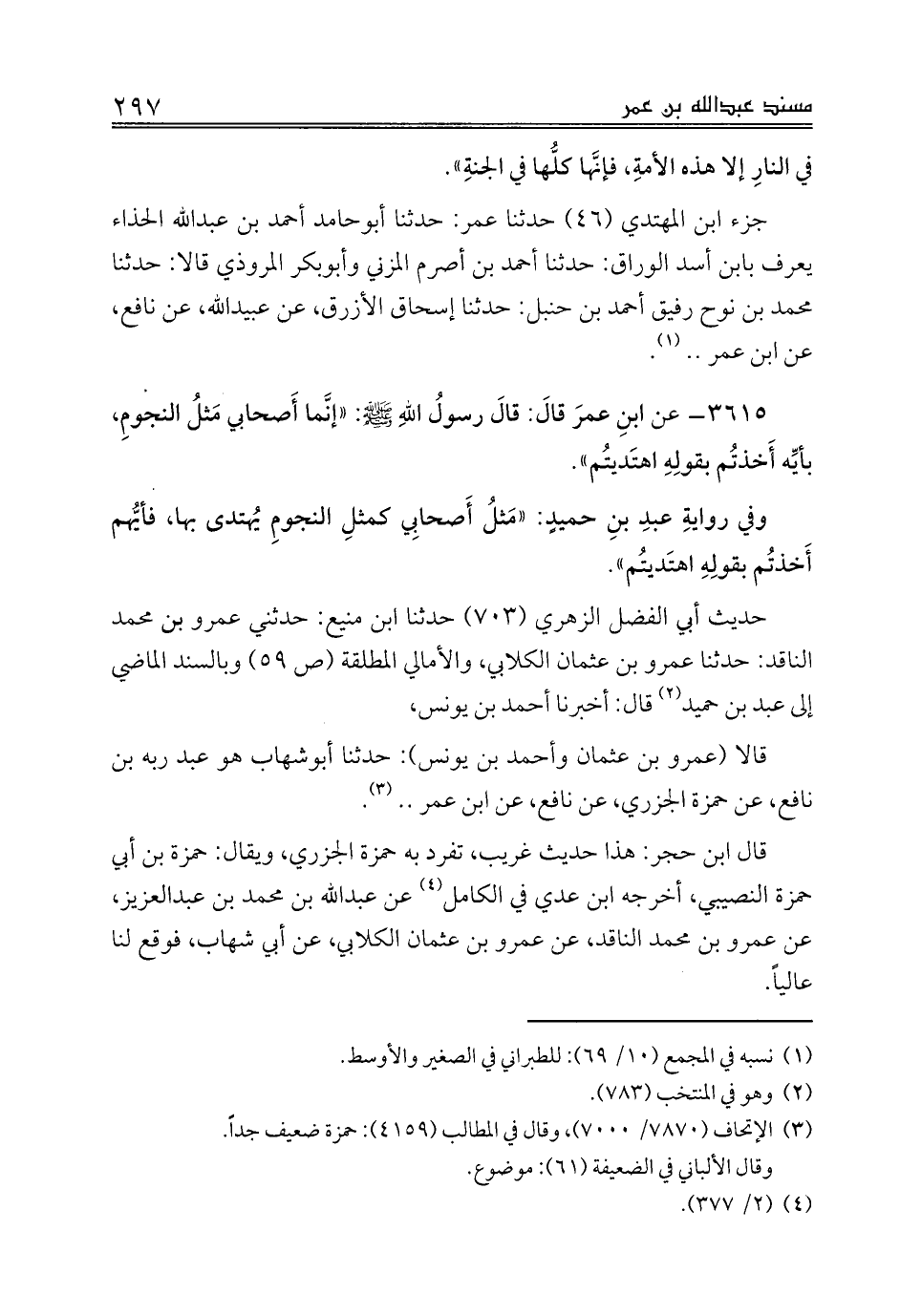 3615 - عن ابنِ عمرَ قالَ: قالَ رسولُ اللهِ صلى الله عليه وسلم: «إنَّما أَصحابي مَثلُ النجومِ، بأيِّه أَخذتُم بقولِهِ اهتَديتُم».