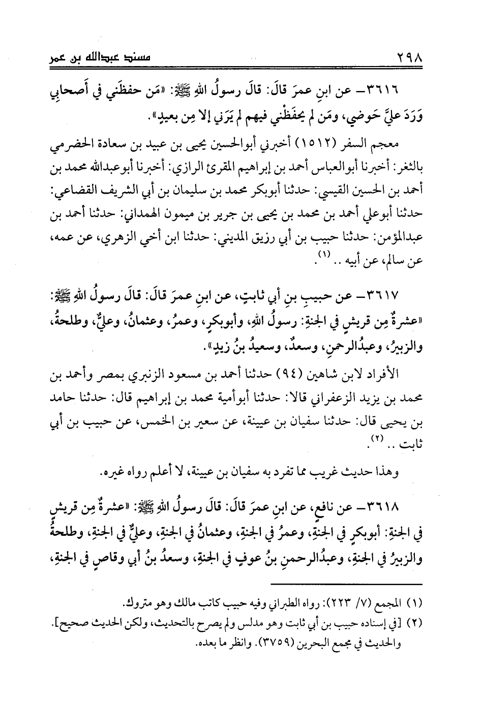 3617 - عن حبيبِ بنِ أبي ثابتٍ، عن ابنِ عمرَ قالَ: قالَ رسولُ اللهِ صلى الله عليه وسلم: «عشرةٌ مِن قريشٍ في الجنةِ: رسولُ اللهِ، وأبوبكرٍ، وعمرُ، وعثمانُ، وعليٌّ، وطلحةُ، والزبيرُ، وعبدُالرحمنِ، وسعدٌ، وسعيدُ بنُ زيدٍ».