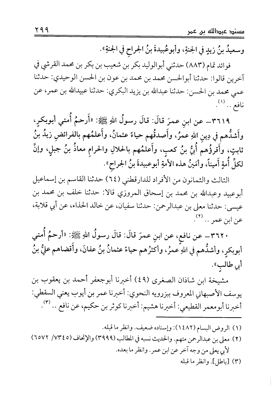 3619 - عن ابنِ عمرَ قالَ: قالَ رسولُ اللهِ صلى الله عليه وسلم: «أَرحمُ أُمتي أبوبكرٍ، وأَشدُّهم في دِينِ اللهِ عمرُ، وأَصدقُهم حياءً عثمانُ، وأَعلمُهم بالفرائضِ زيدُ بنُ ثابتٍ، وأَقرؤُهم أُبيُّ بنُ كعبٍ، وأَعلمُهم بالحلالِ والحرامِ معاذُ بنُ جبلٍ، وإنَّ لكلِّ أُمةٍ أَميناً، وأمَينُ هذه الأمةِ أبوعبيدةَ بنُ الجراحِ».