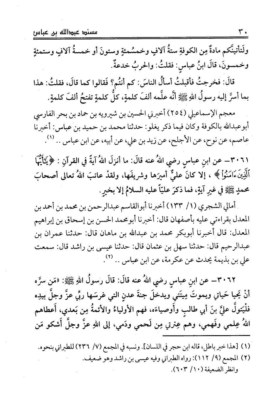 3061 - عن ابنِ عباسٍ رضي اللهُ عنه قالَ: ما أنزلَ اللهُ آيةً في القرآنِ: {يَاأَيُّهَا الَّذِينَ آمَنُوا}، إلا كانَ عليٌّ أميرَها وشريفَها، ولقدْ عاتبَ اللهُ تعالى أصحابَ محمدٍ صلى الله عليه وسلم في غيرِ آيةٍ، فما ذكرَ عليّاً عليه السلامُ إلا بخيرٍ.