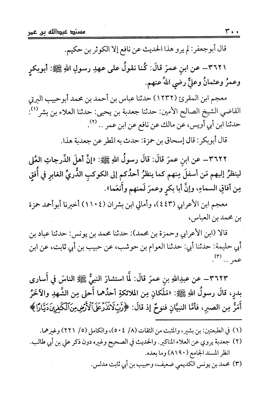 3622 - عن ابنِ عمرَ قالَ: قالَ رسولُ اللهِ صلى الله عليه وسلم: «إنَّ أهلَ الدَّرجاتِ العُلى لينظرُ إليهم مَن أسفلَ مِنهم كما ينظرُ أحدُكم إلى الكوكبِ الدُّريِّ الغابرِ في أُفقٍ مِن آفاقِ السماءِ، وإنَّ أبا بكرٍ وعمرَ لَمنهم وأَنعَما».