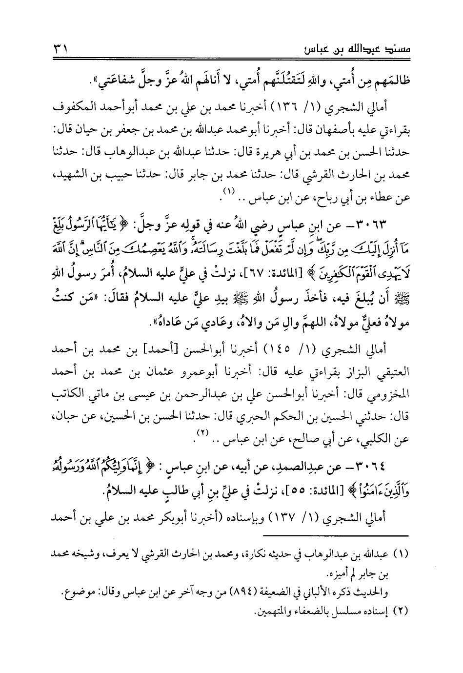 3063 - عن ابنِ عباسٍ رضي اللهُ عنه في قولِه عزَّ وجلَّ: {يَاأَيُّهَا الرَّسُولُ بَلِّغْ مَا أُنْزِلَ إِلَيْكَ مِنْ رَبِّكَ وَإِنْ لَمْ تَفْعَلْ فَمَا بَلَّغْتَ رِسَالَتَهُ وَاللَّهُ يَعْصِمُكَ مِنَ النَّاسِ إِنَّ اللَّهَ لَا يَهْدِي الْقَوْمَ الْكَافِرِينَ} [المائدة: 67]، نزلتْ في عليٍّ عليه السلامُ، أُمرَ رسولُ اللهِ صلى الله عليه وسلم أَن يُبلغَ فيه، فأخذَ رسولُ اللهِ صلى الله عليه وسلم بيدِ عليٍّ عليه السلامُ فقالَ: «مَن كنتُ مولاهُ فعليٌّ مولاهُ، اللهمَّ والِ مَن والاهُ، وعَادي مَن عَاداهُ».