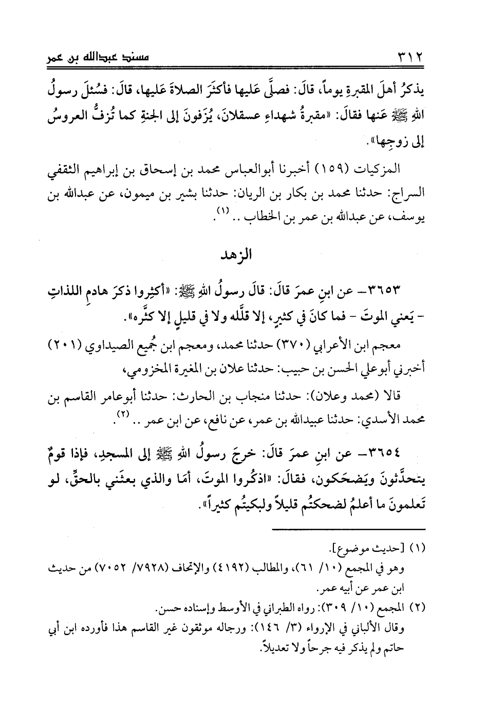 المزكيات (159) أخبرنا أبوالعباس محمد بن إسحاق بن إبراهيم الثقفي السراج: حدثنا محمد بن بكار بن الريان: حدثنا بشير بن ميمون، عن عبدالله بن يوسف، عن عبدالله بن عمر بن الخطاب .. (¬1).