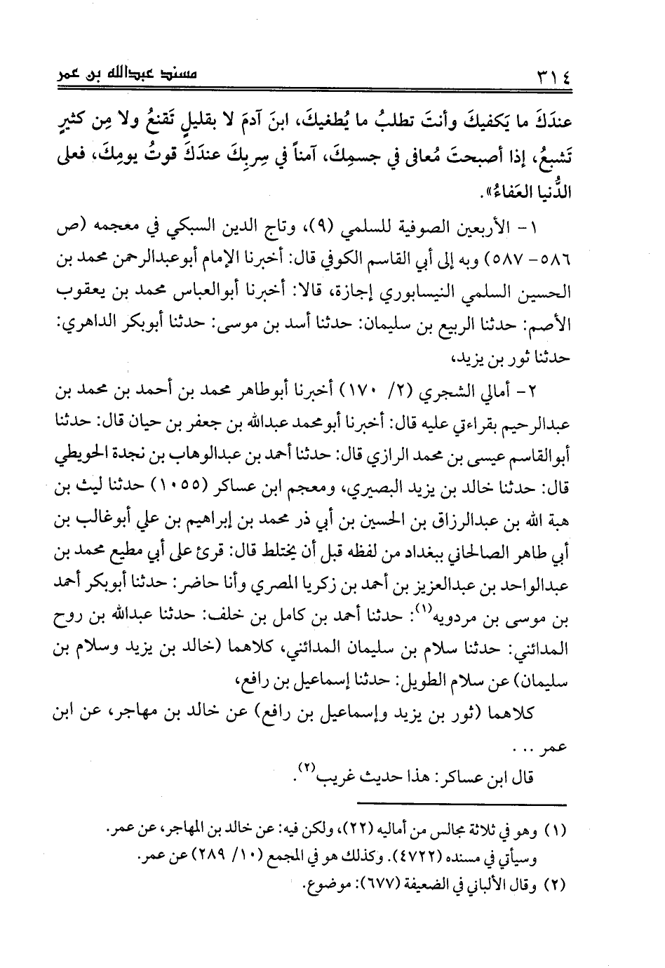 1 - الأربعين الصوفية للسلمي (9)، وتاج الدين السبكي في معجمه (ص 586 - 587) وبه إلى أبي القاسم الكوفي قال: أخبرنا الإمام أبوعبدالرحمن محمد بن الحسين السلمي النيسابوري إجازة، قالا: أخبرنا أبوالعباس محمد بن يعقوب الأصم: حدثنا الربيع بن سليمان: حدثنا أسد بن موسى: حدثنا أبوبكر الداهري: حدثنا ثور بن يزيد،