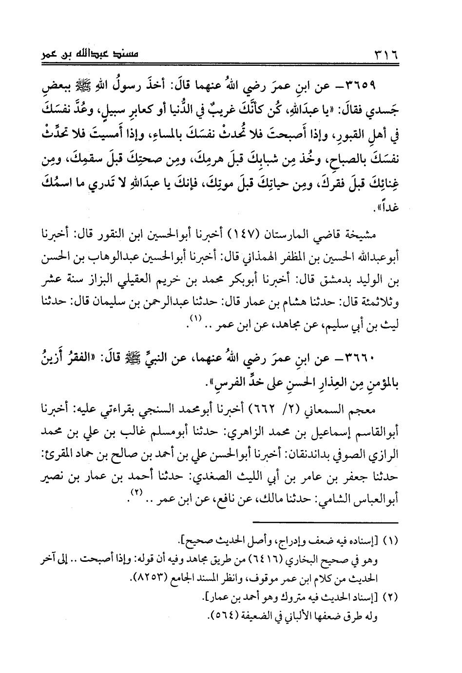 3659 - عن ابنِ عمرَ رضي اللهُ عنهما قالَ: أخذَ رسولُ اللهِ صلى الله عليه وسلم ببعضِ جَسدي فقالَ: «يا عبدَاللهِ، كُن كأنَّكَ غريبٌ في الدُّنيا أو كعابرِ سبيلٍ، وعُدَّ نفسَكَ في أهلِ القبورِ، وإذا أَصبحتَ فلا تُحدثْ نفسَكَ بالمساءِ، وإذا أَمسيتَ فلا تحدِّثْ نفسَكَ بالصباحِ، وخُذ مِن شبابِكَ قبلَ هرمِكَ، ومِن صحتِكَ قبلَ سقمِكَ، ومِن غِنائِكَ قبلَ فقركَ، ومِن حياتِكَ قبلَ موتِكَ، فإنكَ يا عبدَاللهِ لا تَدري ما اسمُكَ غداً».