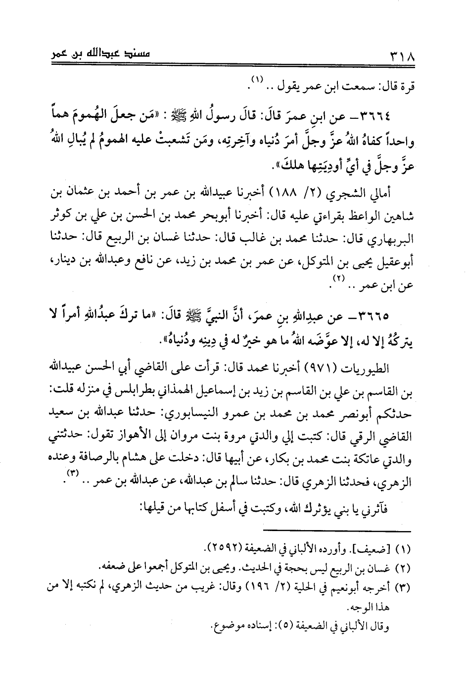 3664 - عن ابنِ عمرَ قالَ: قالَ رسولُ اللهِ صلى الله عليه وسلم: «مَن جعلَ الهُمومَ هماً واحداً كفاهُ اللهُ عزَّ وجلَّ أمرَ دُنياه وآخِرتِه، ومَن تَشعبتْ عليه الهمومُ لم يُبالِ اللهُ عزَّ وجلَّ في أيِّ أودِيَتِها هلكَ».