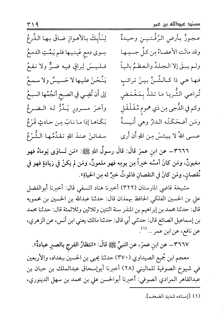 3666 - عن ابنِ عمرَ قالَ: قالَ رسولُ اللهِ صلى الله عليه وسلم: «مَن تَساوَى يَوماهُ فهو مغبونٌ، ومَن كانَ أمسُه خيراً مِن يومِه فهو ملعونٌ، ومَن لم يكنْ في زيادةٍ فهو في نُقصانٍ، ومَن كانَ في النقصانِ فالموتُ خيرٌ له مِن الحياةِ».
