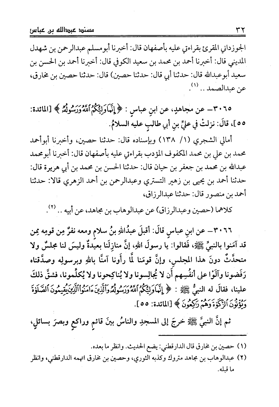 3066 - عن ابنِ عباسٍ قالَ: أقبلَ عبدُاللهِ بنُ سلامٍ ومعه نفرٌ مِن قومِه مِمن قد آمَنوا بالنبيِّ صلى الله عليه وسلم، فَقالوا: يا رسولَ اللهِ، إنَّ منازِلَنا بعيدةٌ وليسَ لنا مجلسٌ ولا متحدَّثٌ دونَ هذا المجلسِ، وإنَّ قومَنا لمَّا رأَونا آمنَّا باللهِ وبرسولِه وصدَّقناه رَفَضونا وآلوا على أنفُسِهم أَن لا يُجالِسونا ولا يُناكِحونا ولا يُكلِّمونا، فشقَّ ذلكَ علينا، فقالَ له النبيُّ صلى الله عليه وسلم: {إِنَّمَا وَلِيُّكُمُ اللَّهُ وَرَسُولُهُ وَالَّذِينَ آمَنُوا الَّذِينَ يُقِيمُونَ الصَّلَاةَ وَيُؤْتُونَ الزَّكَاةَ وَهُمْ رَاكِعُونَ} [المائدة: 55].