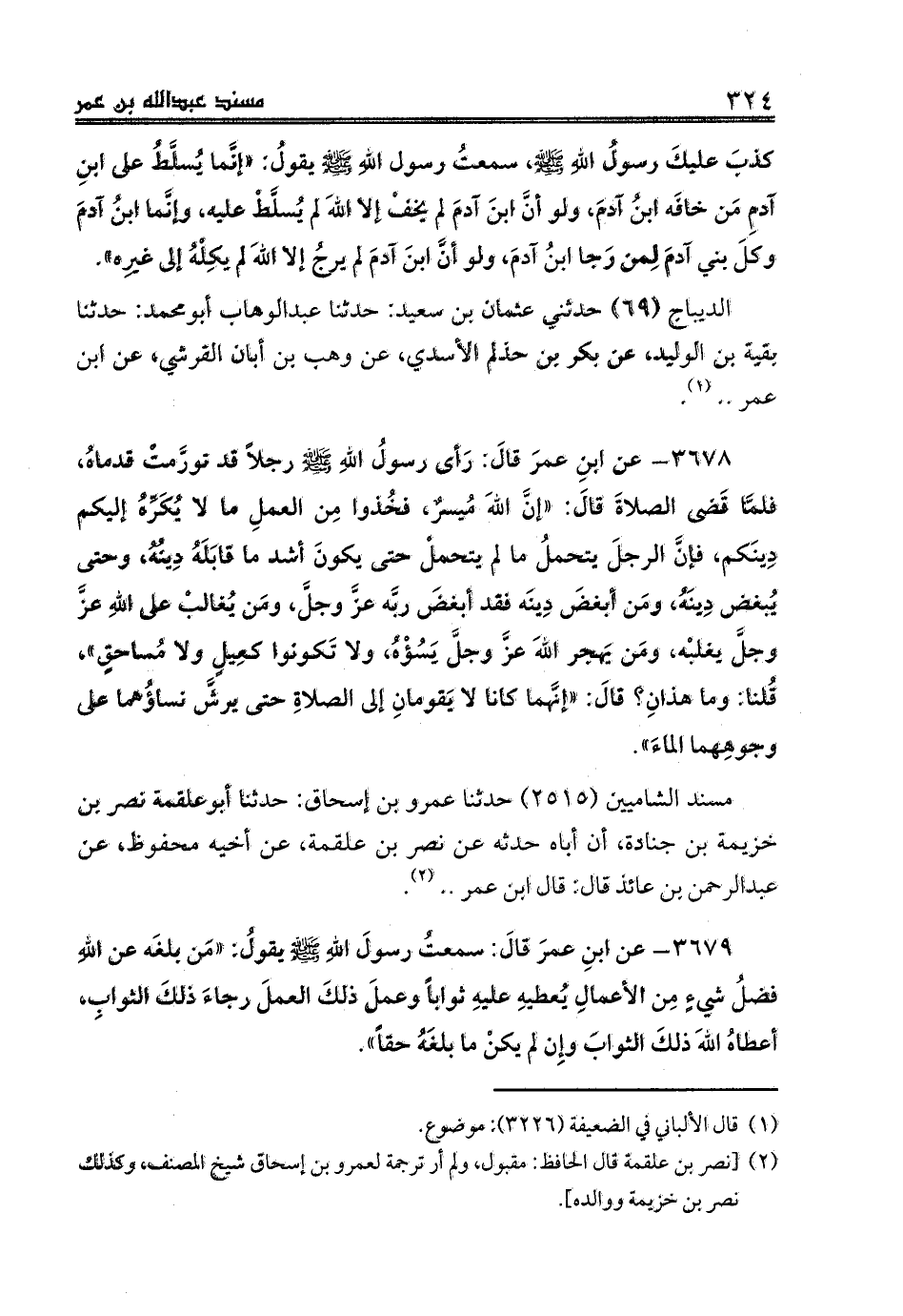 3678 - عن ابنِ عمرَ قالَ: رَأى رسولُ اللهِ صلى الله عليه وسلم رجلاً قد تورَّمتْ قدماهُ، فلمَّا قَضى الصلاةَ قالَ: «إنَّ اللهَ مُيسرٌ، فخُذوا مِن العملِ ما لا يُكَرِّهُ إليكم دِينَكم، فإنَّ الرجلَ يتحملُ ما لم يتحملْ حتى يكونَ أشد ما قابَلَهُ دِينُهُ، وحتى يُبغض دِينَهُ، ومَن أبغضَ دِينَه فقد أبغضَ ربَّه عزَّ وجلَّ، ومَن يُغالبْ على اللهِ عزَّ وجلَّ يغلبْه، ومَن يَهجر اللهَ عزَّ وجلَّ يَسُؤْهُ، ولا تَكونوا كعِيلٍ ولا مُساحقٍ»، قُلنا: وما هذانِ؟ قالَ: «إنَّهما كانا لا يَقومانِ إلى الصلاةِ حتى يرشَّ نساؤُهما على وجوهِهما الماءَ».