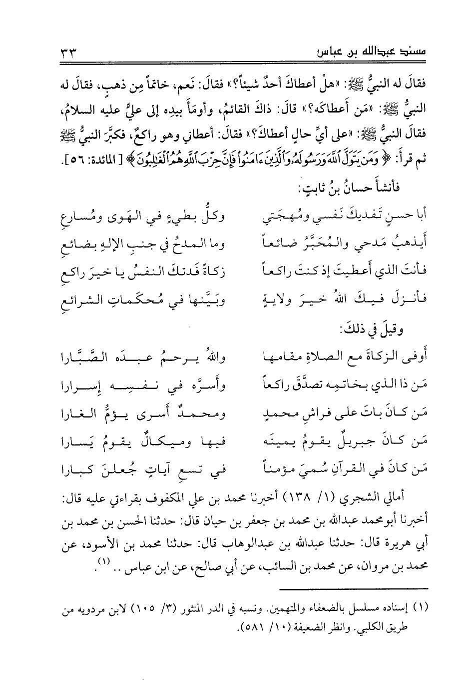 فقالَ له النبيُّ صلى الله عليه وسلم: «هلْ أعطاكَ أحدٌ شيئاً؟» فقالَ: نَعم، خاتماً مِن ذهبٍ، فقالَ له النبيُّ صلى الله عليه وسلم: «مَن أَعطاكَه؟» قالَ: ذاكَ القائمُ، وأومَأَ بيدِه إلى عليٍّ عليه السلامُ، فقالَ النبيُّ صلى الله عليه وسلم: «على أيِّ حالٍ أعطاكَ؟» فقالَ: أعطاني وهو راكعٌ، فكبَّرَ النبيُّ صلى الله عليه وسلم ثم قرأَ: {وَمَنْ يَتَوَلَّ اللَّهَ وَرَسُولَهُ وَالَّذِينَ آمَنُوا فَإِنَّ حِزْبَ اللَّهِ هُمُ الْغَالِبُونَ} [المائدة: 56].