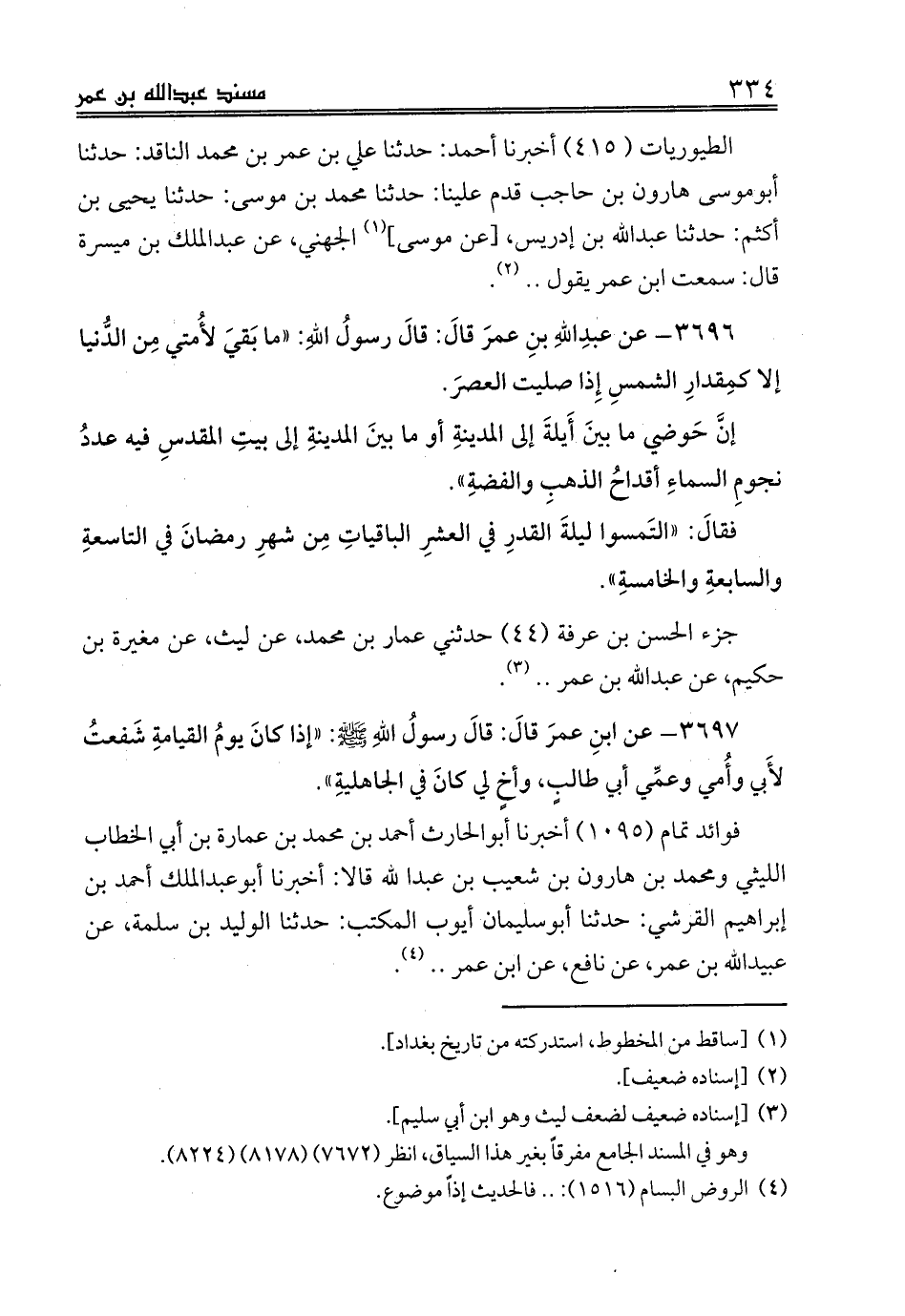 الطيوريات (415) أخبرنا أحمد: حدثنا علي بن عمر بن محمد الناقد: حدثنا أبوموسى هارون بن حاجب قدم علينا: حدثنا محمد بن موسى: حدثنا يحيى بن أكثم: حدثنا عبدالله بن إدريس، [عن موسى] (¬1) الجهني، عن عبدالملك بن ميسرة قال: سمعت ابن عمر يقول .. (¬2).