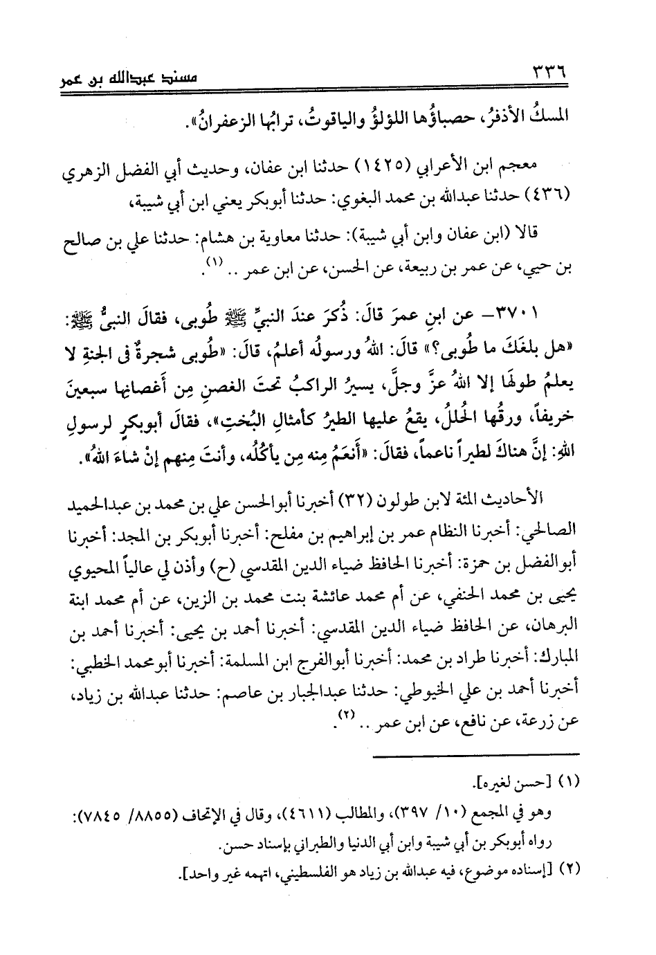 3701 - عن ابنِ عمرَ قالَ: ذُكرَ عندَ النبيِّ صلى الله عليه وسلم طُوبى، فقالَ النبىُّ صلى الله عليه وسلم: «هل بلغَكَ ما طُوبى؟» قالَ: اللهُ ورسولُه أعلمُ، قالَ: «طُوبى شجرةٌ فى الجنةِ لا يعلمُ طولَها إلا اللهُ عزَّ وجلَّ، يسيرُ الراكبُ تحتَ الغصنِ مِن أَغصانِها سبعينَ خريفاً، ورقُها الحُللُ، يقعُ عليها الطيرُ كأمثالِ البُختِ»، فقالَ أبوبكرٍ لرسولِ اللهِ: إنَّ هناكَ لطيراً ناعماً، فقالَ: «أَنعَمُ مِنه مِن يأكُلُه، وأنتَ مِنهم إنْ شاءَ اللهُ».
