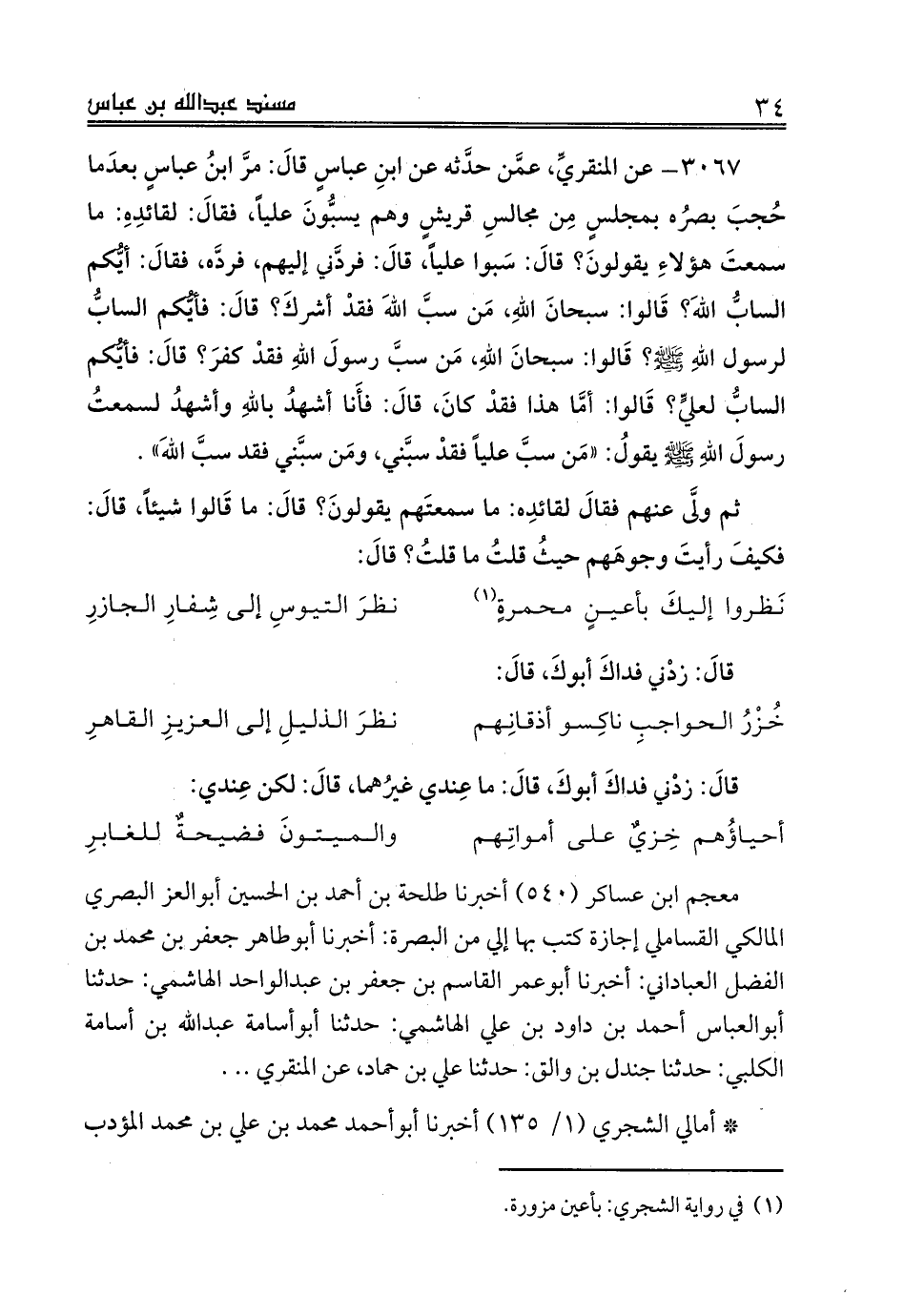 معجم ابن عساكر (540) أخبرنا طلحة بن أحمد بن الحسين أبوالعز البصري المالكي القساملي إجازة كتب بها إلي من البصرة: أخبرنا أبوطاهر جعفر بن محمد بن الفضل العباداني: أخبرنا أبوعمر القاسم بن جعفر بن عبدالواحد الهاشمي: حدثنا أبوالعباس أحمد بن داود بن علي الهاشمي: حدثنا أبوأسامة عبدالله بن أسامة الكلبي: حدثنا جندل بن والق: حدثنا علي بن حماد، عن المنقري .. .