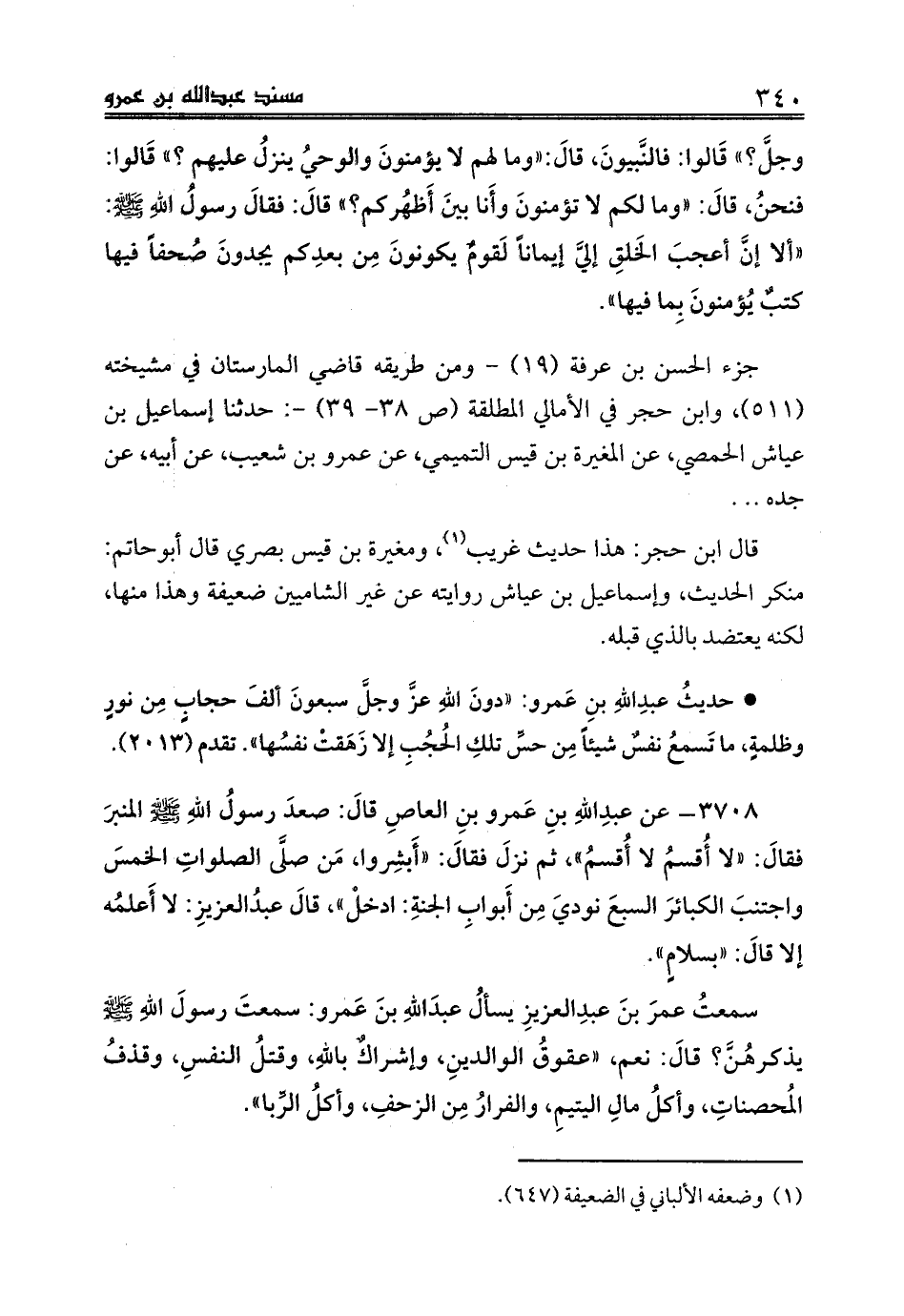 سمعتُ عمرَ بنَ عبدِالعزيزِ يسألُ عبدَاللهِ بنَ عَمرو: سمعتَ رسولَ اللهِ صلى الله عليه وسلم يذكرهُنَّ؟ قالَ: نعم، «عقوقُ الوالدينِ، وإشراكٌ باللهِ، وقتلُ النفسِ، وقذفُ المُحصناتِ، وأكلُ مالِ اليتيمِ، والفرارُ مِن الزحفِ، وأكلُ الرِّبا».