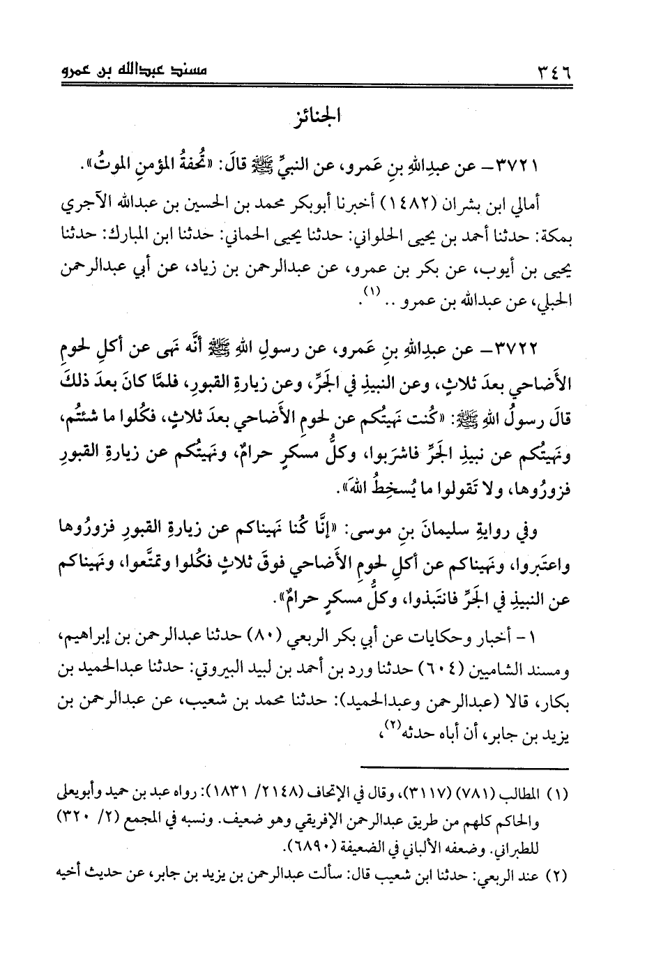 3723 - عن عبدِاللهِ بنِ عَمرو (¬3) قالَ: قالَ النبيُّ صلى الله عليه وسلم: «مَن شهدَ إملاكَ رجلٍ مسلمٍ كانَ كمَن صامَ يوماً في سبيلِ اللهِ، واليومُ بسبعِمئةِ يومٍ، ومَن شهدَ جنازةَ امرئٍ مسلمٍ كانَ كمَن صامَ يوماً في سبيلِ اللهِ، واليومُ بسبعِمئةِ يومٍ، ومَن عادَ مريضاً كانَ كمَن صامَ يوماً في سبيلِ اللهِ، واليومُ بسبعِمئةِ يومٍ، ومَن اغتسلَ يومَ الجمعةِ وشهدَ الجمعةَ كانَ كمَن صامَ يوماً في سبيلِ اللهِ، واليومُ بسبعِمئةِ