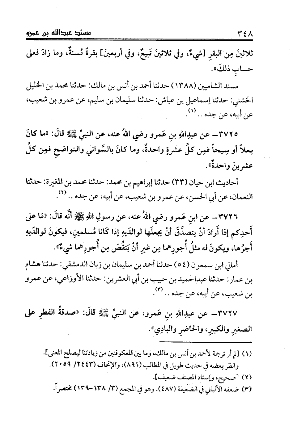 3727 - عن عبدِاللهِ بنِ عَمرو، عن النبيِّ صلى الله عليه وسلم قالَ: «صدقةُ الفطرِ على الصغيرِ والكبيرِ، والحاضرِ والبادِي».