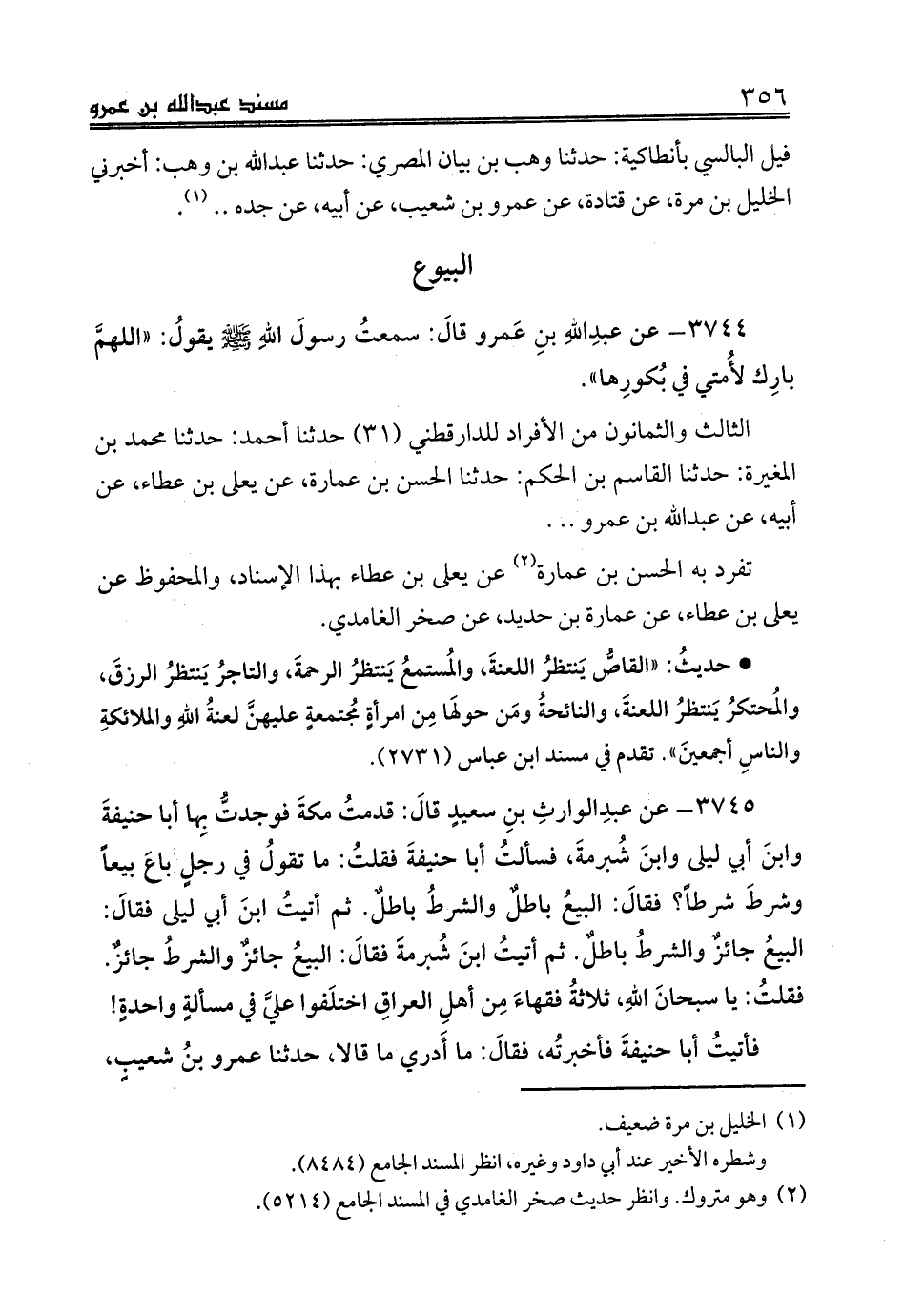 فأتيتُ أبا حنيفةَ فأخبرتُه، فقالَ: ما أَدري ما قالا، حدثنا عمرو بنُ شعيبٍ، عن أبيه، عن جدِّه، أنَّ النبيَّ صلى الله عليه وسلم نَهى عن بيعٍ وشرطٍ. البيعُ باطلٌ والشرطُ باطلٌ.