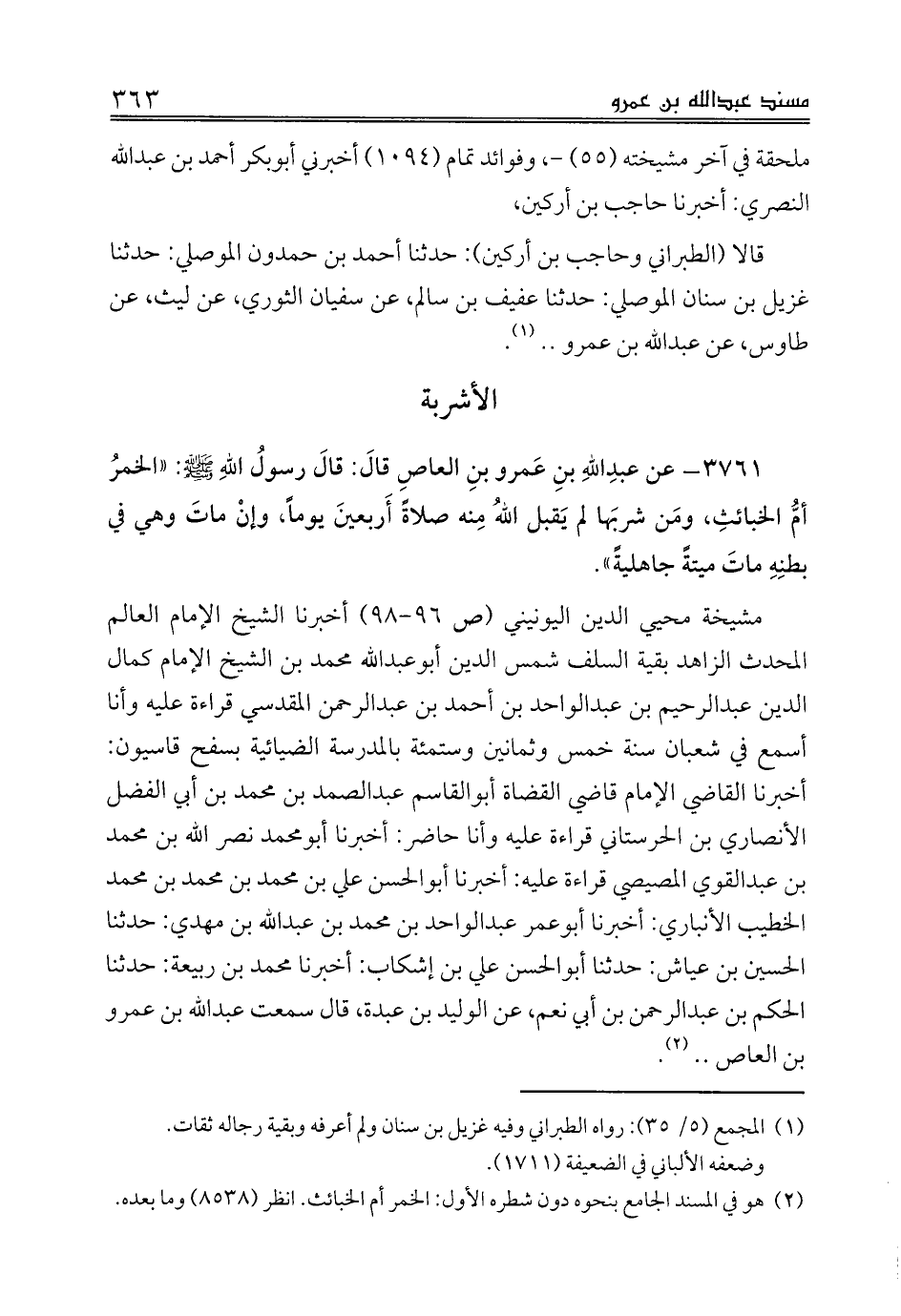 مشيخة محيي الدين اليونيني (ص 96 - 98) أخبرنا الشيخ الإمام العالم المحدث الزاهد بقية السلف شمس الدين أبوعبدالله محمد بن الشيخ الإمام كمال الدين عبدالرحيم بن عبدالواحد بن أحمد بن عبدالرحمن المقدسي قراءة عليه وأنا أسمع في شعبان سنة خمس وثمانين وستمئة بالمدرسة الضيائية بسفح قاسيون: أخبرنا القاضي الإمام قاضي القضاة أبوالقاسم عبدالصمد بن محمد بن أبي الفضل الأنصاري بن الحرستاني قراءة عليه وأنا حاضر: أخبرنا أبومحمد نصر الله بن محمد بن عبدالقوي المصيصي قراءة عليه: أخبرنا أبوالحسن علي بن محمد بن محمد بن محمد الخطيب الأنباري: أخبرنا أبوعمر عبدالواحد بن محمد بن عبدالله بن مهدي: حدثنا الحسين بن عياش: حدثنا أبوالحسن علي بن إشكاب: أخبرنا محمد بن ربيعة: حدثنا الحكم بن عبدالرحمن بن أبي نعم، عن الوليد بن عبدة، قال سمعت عبدالله بن عمرو بن العاص .. (¬2).