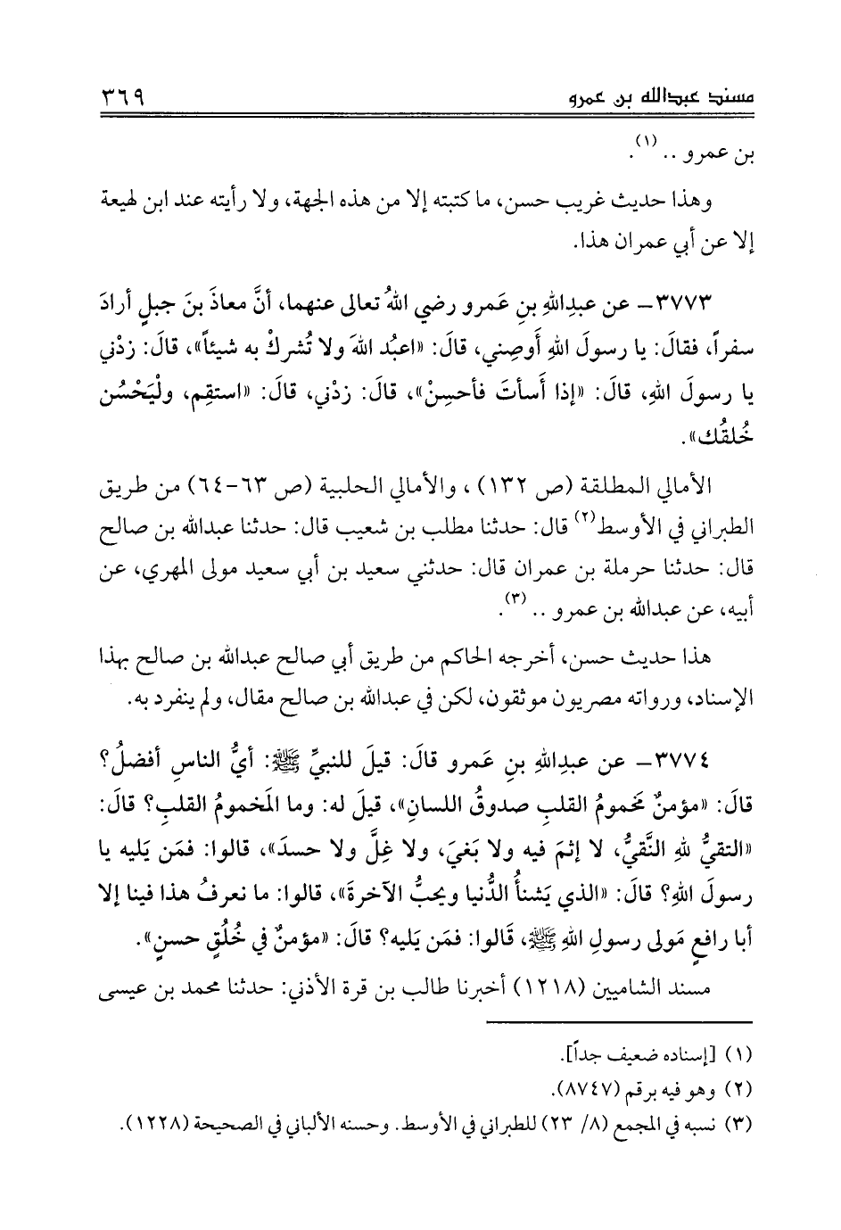 3774 - عن عبدِاللهِ بنِ عَمرو قالَ: قيلَ للنبيِّ صلى الله عليه وسلم: أيُّ الناسِ أفضلُ؟ قالَ: «مؤمنٌ مَخمومُ القلبِ صدوقُ اللسانِ»، قيلَ له: وما المَخمومُ القلبِ؟ قالَ: «التقيُّ للهِ النَّقيُّ، لا إثمَ فيه ولا بَغيَ، ولا غِلَّ ولا حسدَ»، قالوا: فمَن يَليه يا رسولَ اللهِ؟ قالَ: «الذي يَشنأَ الدُّنيا ويحبُ الآخرةَ»، قالوا: ما نعرفُ هذا فينا إلا أبا رافعٍ مَولى رسولِ اللهِ صلى الله عليه وسلم، قَالوا: فمَن يَليه؟ قالَ: «مؤمنٌ في خُلُقٍ حسنٍ».