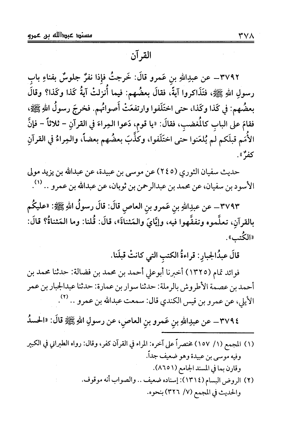 3793 - عن عبدِاللهِ بنِ عَمرو بنِ العاصِ قالَ: قالَ رسولُ اللهِ صلى الله عليه وسلم: «عليكُم بالقرآنِ، تعلَّموه وتفقَّهوا فيه، وإيَّايَ والمَثناةَ»، قالَ: قُلنا: وما المَثناةُ؟ قالَ: «الكُتب».
