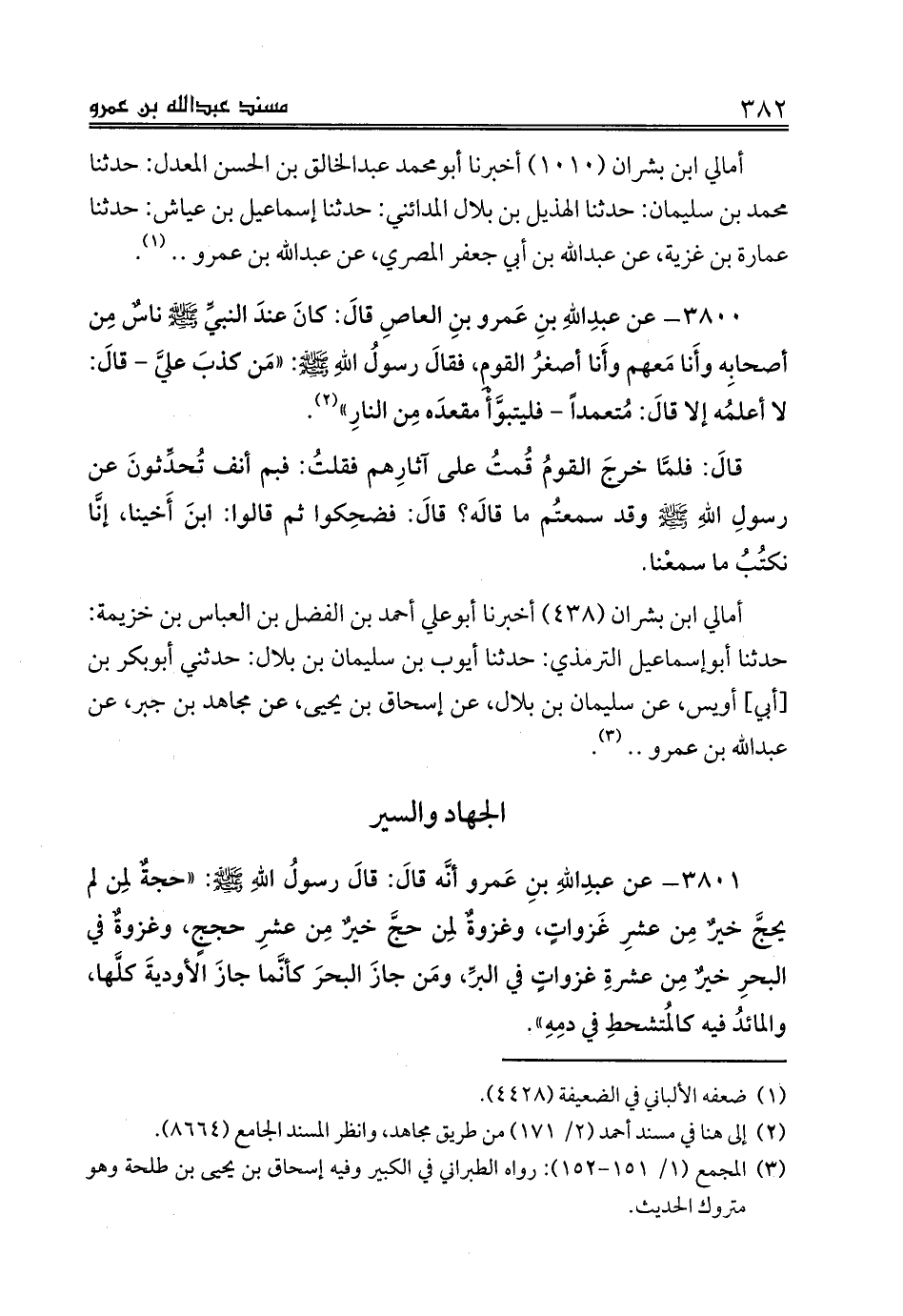 3800 - عن عبدِاللهِ بنِ عَمرو بنِ العاصِ قالَ: كانَ عندَ النبيِّ صلى الله عليه وسلم ناسٌ مِن أصحابِه وأَنا مَعهم وأَنا أصغرُ القومِ، فقالَ رسولُ اللهِ صلى الله عليه وسلم: «مَن كذبَ عليَّ - قالَ: لا أعلمُه إلا قالَ: مُتعمداً - فليتبوَّأْ مقعدَه مِن النارِ» (¬2).