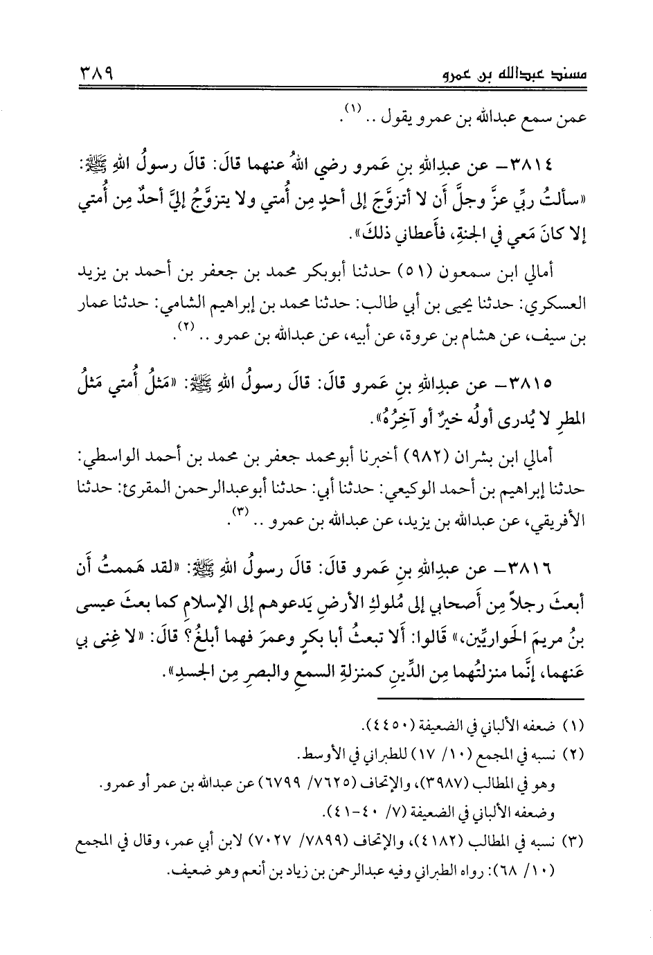 3816 - عن عبدِاللهِ بنِ عَمرو قالَ: قالَ رسولُ اللهِ صلى الله عليه وسلم: «لقد هَممتُ أَن أبعثَ رجلاً مِن أَصحابي إلى مُلوكِ الأرضِ يَدعوهم إلى الإسلامِ كما بعثَ عيسى بنُ مريمَ الحَواريِّين،» قَالوا: أَلا تبعثُ أبا بكرٍ وعمرَ فهما أبلغُ؟ قالَ: «لا غِنى بي عَنهما، إنَّما منزلتُهما مِن الدِّينِ كمنزلةِ السمعِ والبصرِ مِن الجسدِ».