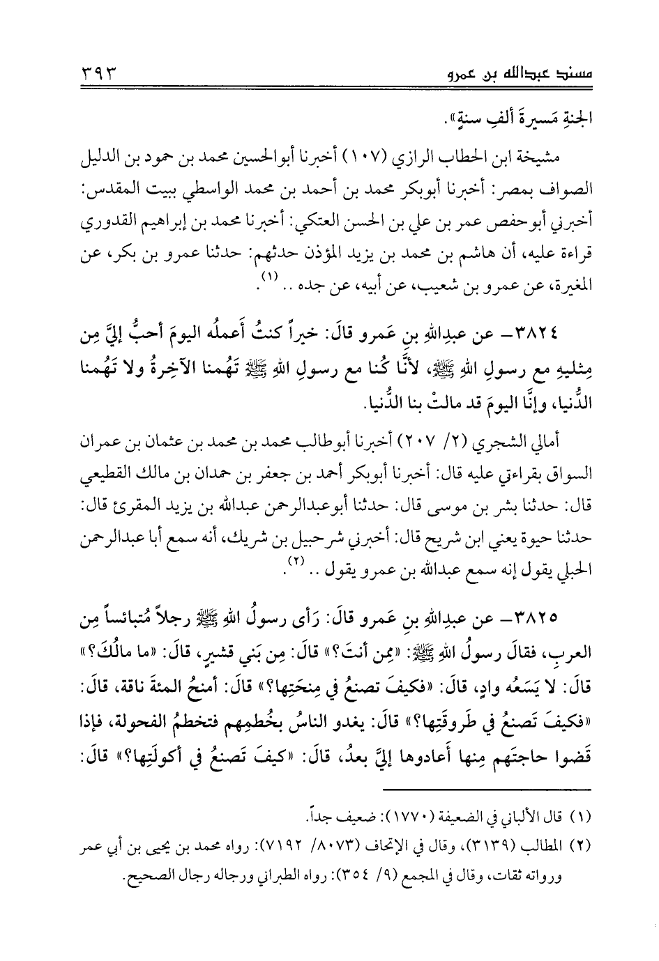 3825 - عن عبدِاللهِ بنِ عَمرو قالَ: رَأى رسولُ اللهِ صلى الله عليه وسلم رجلاً مُتبائساً مِن العربِ، فقالَ رسولُ اللهِ صلى الله عليه وسلم: «مِمن أنتَ؟» قالَ: مِن بَني قشيرٍ، قالَ: «ما مالُكَ؟» قالَ: لا يَسَعُه وادٍ، قالَ: «فكيفَ تصنعُ في مِنحَتِها؟» قالَ: أمنحُ المئةَ ناقةٍ، قالَ: «فكيفَ تَصنعُ في طَروقَتِها؟» قالَ: يغدو الناسُ بخُطمِهم فتخطمُ الفحولة، فإذا قَضوا حاجتَهم مِنها أَعادوها إليَّ بعدُ، قالَ: «كيفَ تَصنعُ في أكولَتِها؟» قالَ: