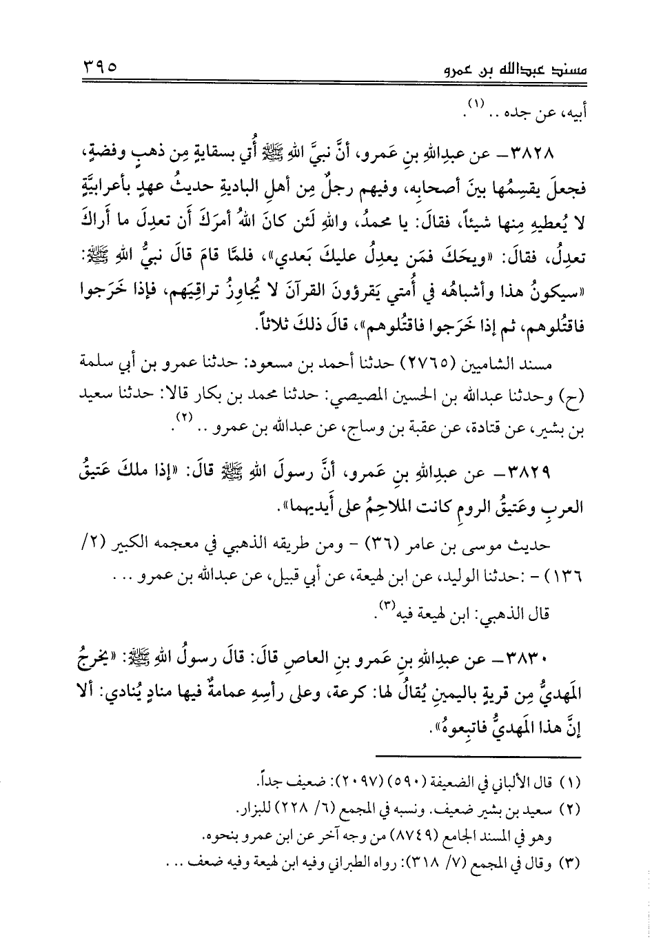 3828 - عن عبدِاللهِ بنِ عَمرو، أنَّ نبيَّ اللهِ صلى الله عليه وسلم أُتي بسقايةٍ مِن ذهبٍ وفضةٍ، فجعلَ يقسِمُها بينَ أصحابِه، وفيهم رجلٌ مِن أهلِ الباديةِ حديثُ عهدٍ بأعرابيَّةٍ لا يُعطيهِ مِنها شيئاً، فقالَ: يا محمدُ، واللهِ لَئن كانَ اللهُ أمرَكَ أَن تعدِلَ ما أَراكَ تعدِلُ، فقالَ: «ويحَكَ فمَن يعدِلُ عليكَ بَعدي»، فلمَّا قامَ قالَ نبيُّ اللهِ صلى الله عليه وسلم: «سيكونُ هذا وأشباهُه في أُمتي يَقرؤونَ القرآنَ لا يُجاوِزُ تراقِيَهم، فإذا خَرَجوا فاقتُلوهم، ثم إذا خَرَجوا فاقتُلوهم»، قالَ ذلكَ ثلاثاً.