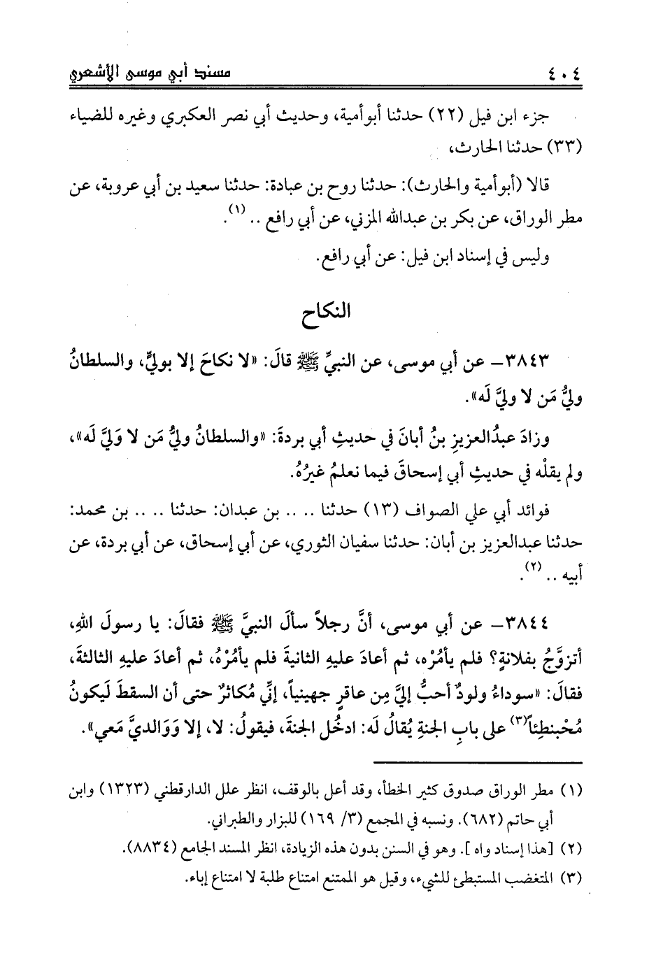 3844 - عن أبي موسى، أنَّ رجلاً سألَ النبيَّ صلى الله عليه وسلم فقالَ: يا رسولَ اللهِ، أتزوَّجُ بفلانةٍ؟ فلم يأمُرْه، ثم أعادَ عليهِ الثانيةَ فلم يأمُرْهُ، ثم أعادَ عليهِ الثالثةَ، فقالَ: «سوداءُ ولودٌ أحبُّ إليَّ مِن عاقرٍ جهينياً، إنِّي مُكاثرٌ حتى أن السقطَ لَيكونُ مُحْبنطِئاً (¬3) على بابِ الجنةِ يُقالُ لَه: ادخُل الجنةَ، فيقولُ: لا، إلا وَوَالديَّ مَعي».