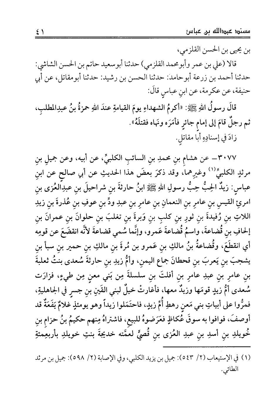 3077 - عن هشامِ بنِ محمدِ بنِ السائبِ الكلبيِّ، عن أبيه، وعن جميلِ بنِ مرثدٍ الكلبيِّ (¬1) وغيرِهما، وقد ذكرَ بعضَ هذا الحديثِ عن أبي صالحٍ عن ابنِ عباسٍ: زيدٌ الحِبُّ حِبُّ رسولِ اللهِ صلى الله عليه وسلم ابنُ حارثةَ بنِ شراحيلَ بنِ عبدِالعُزى بنِ امرئِ القيسِ بنِ عامرِ بنِ النعمانِ بنِ عامرِ بنِ عبدِ ودِّ بنِ عوفِ بنِ عُذرةَ بنِ زيدِ اللاتِ بنِ رُفيدةَ بنِ ثورِ بنِ كلبِ بنِ وَبرةَ بنِ تغلبَ بنِ حلوانَ بنِ عمرانَ بنِ إلحافِ بنِ قُضاعةَ، واسمُ قُضاعةَ عَمرو، وإنَّما سُمي قضاعةَ لأنَّه انقضَعَ عن قومِه أي انقطَعَ، وقُضاعةُ بنُ مالكِ بنِ عَمرو بن مُرةَ بنِ مالكِ بنِ حمير بنِ سبأ بنِ يشجبَ بنِ يَعربَ بنِ قحطانَ جماع اليمنِ، وأمُّ زيدِ بنِ حارثةَ سُعدى بنتُ ثعلبةَ بنِ عامرِ بنِ عبدِ عامرِ بنِ أفلتَ بنِ سلسلةَ مِن بَني معنٍ مِن طيءٍ، فزارَت سُعدى أمُّ زيدٍ قومَها وزيدٌ معها، فأغارتْ خيلٌ لبني القَينِ بنِ جسرٍ في الجاهليةِ، فمرُّوا على أبياتِ بني مَعنٍ رهطِ أُمِّ زيدٍ، فاحتَمَلوا زيداً وهو يومئذٍ غلامٌ يَفَعَةٌ قد أوصفَ، فوافوا به سوقَ عُكاظٍ فعَرَضوهُ للبيعِ، فاشتراهُ مِنهم حكيمُ بنُ حزامِ بنِ خُويلدِ بنِ أسدِ بنِ عبدِ العُزى بنِ قُصيٍّ لعمَّته خديجةَ بنتِ خويلدِ بأربعِمئةِ