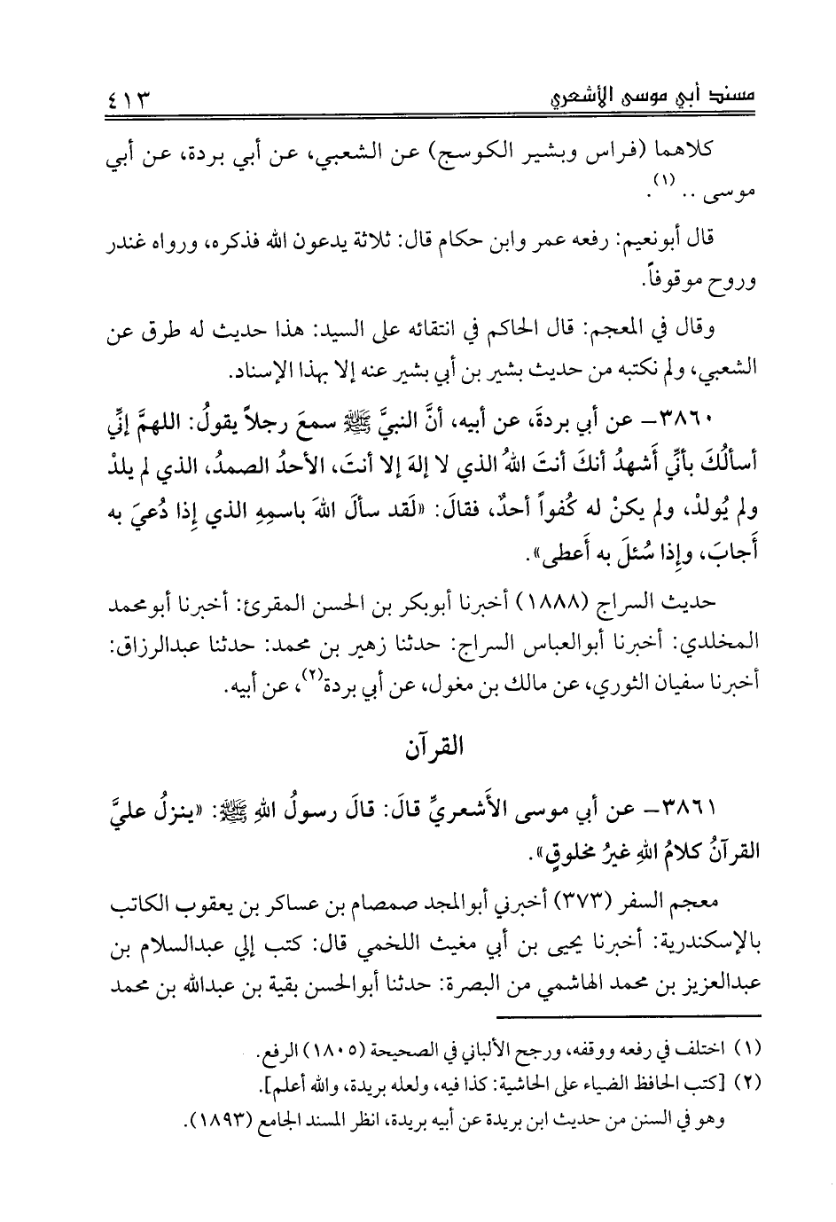 3861 - عن أبي موسى الأَشعريِّ قالَ: قالَ رسولُ اللهِ صلى الله عليه وسلم: «ينزلُ عليَّ القرآنُ كلامُ اللهِ غيرُ مخلوقٍ».