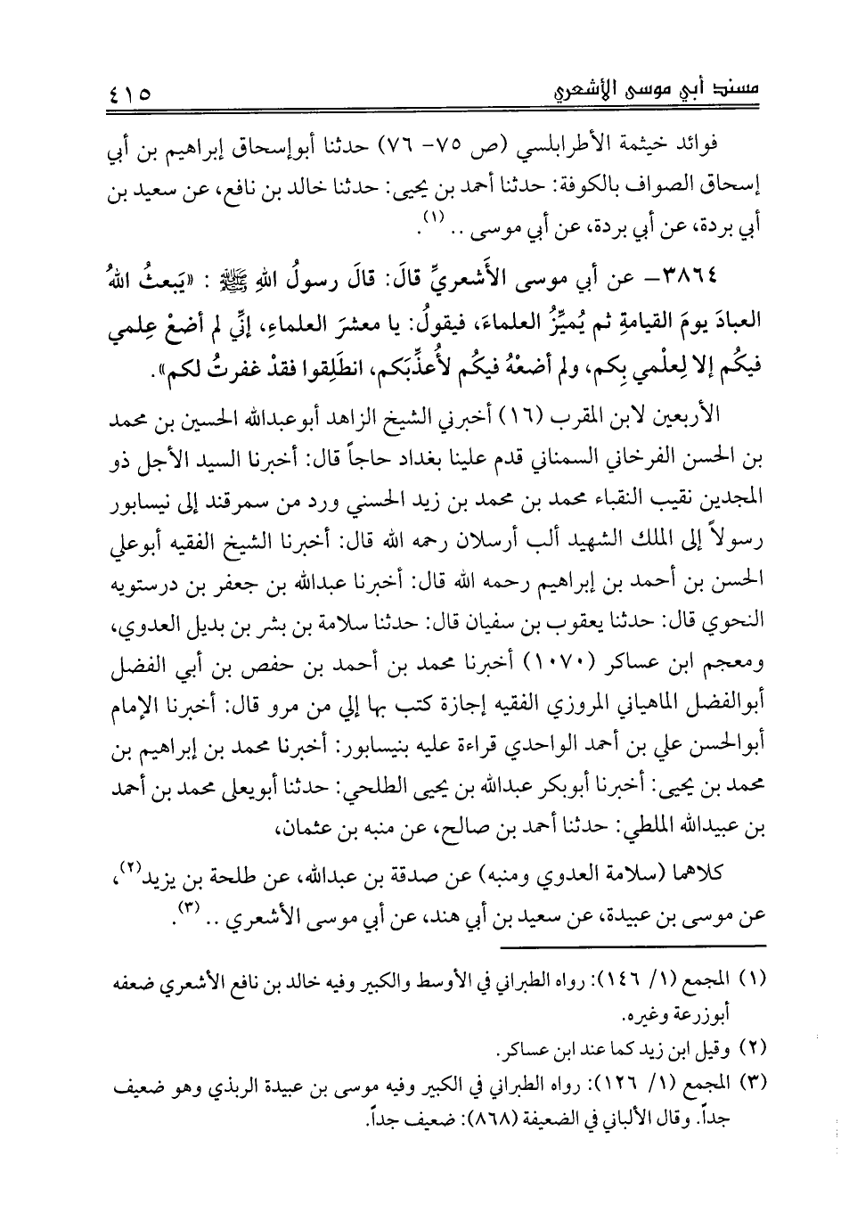 كلاهما (سلامة العدوي ومنبه) عن صدقة بن عبدالله، عن طلحة بن يزيد (¬2)، عن موسى بن عبيدة، عن سعيد بن أبي هند، عن أبي موسى الأشعري .. (¬3).