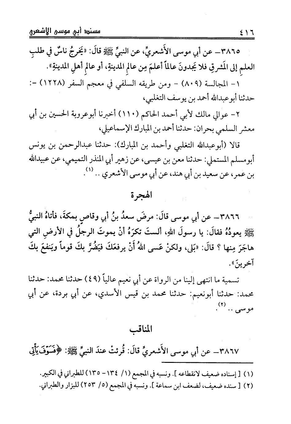 3865 - عن أبي موسى الأَشعريِّ، عن النبيِّ صلى الله عليه وسلم قالَ: «يَخرجُ ناسٌ في طلبِ العلمِ إلى المَشرقِ فلا يَجدونَ عالماً أعلمَ مِن عالمِ المدينةِ، أو عالمَ أهلِ المدينةِ».