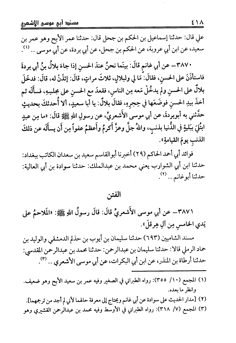 3871 - عن أبي موسى الأَشعريِّ قالَ: قالَ رسولُ اللهِ صلى الله عليه وسلم: «المَلاحمُ على يَدي الخامسِ مِن آلِ هِرقلَ».